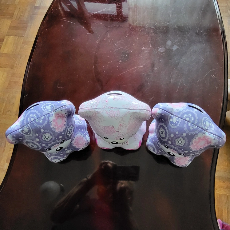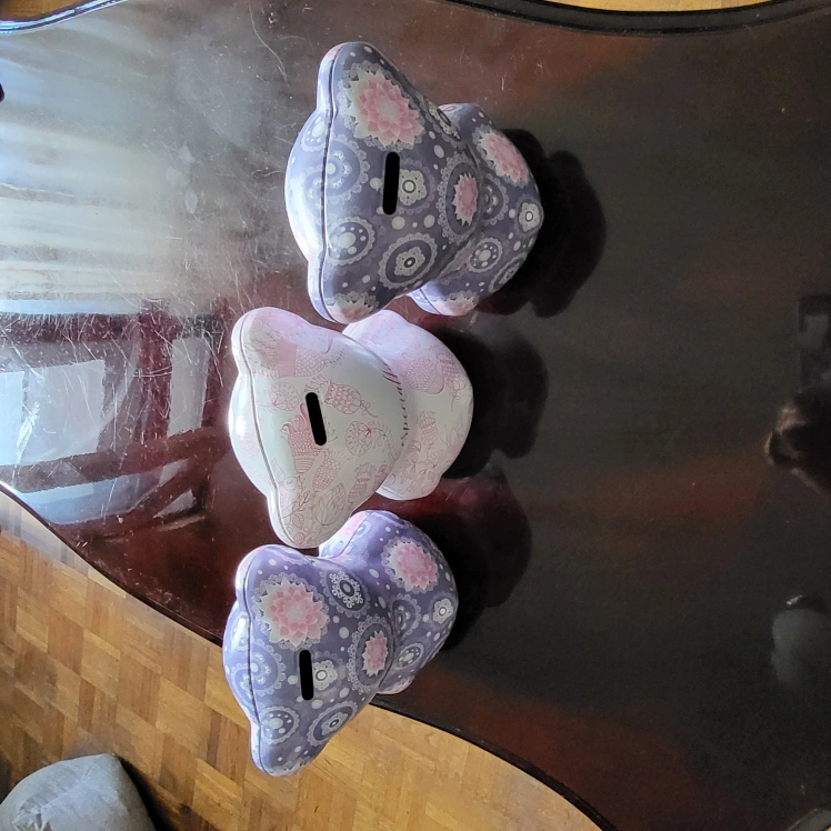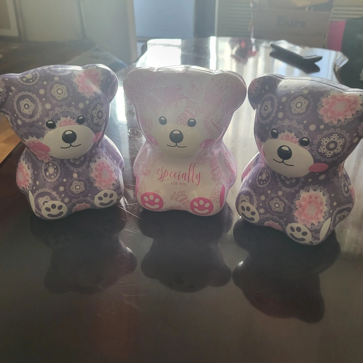 Selling a set of three adorable teddy bear coin banks! Two are a lovely lavender colour with floral designs, and one is a sweet pink with a 'specially for you' message. Perfect for kids or anyone who loves cute decor