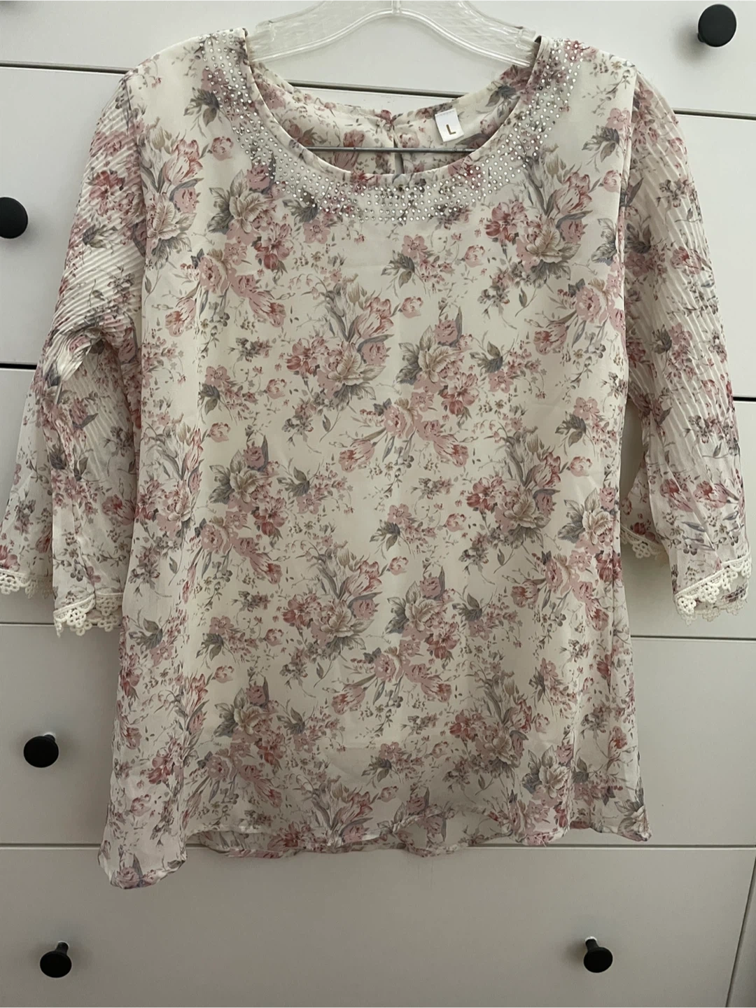 A lovely floral print blouse, perfect for adding a touch of elegance to your wardrobe! The blouse features a beautiful floral pattern in shades of pink and white. It has a round neckline adorned with decorative stones and three-quarter sleeves with delicate lace trim. The size is L.