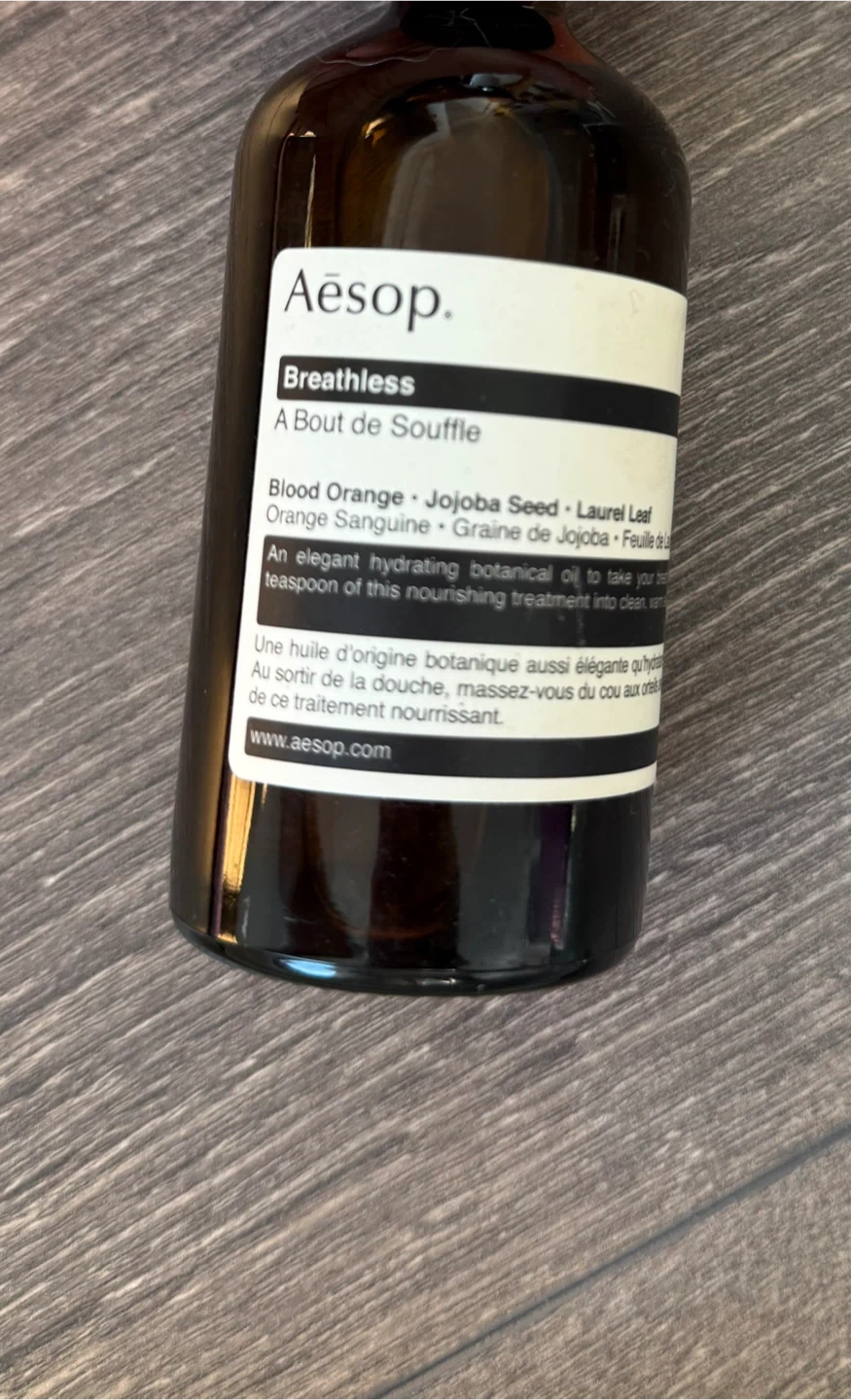 Selling a bottle of Aesop Breathless body oil. This is a hydrating botanical oil that leaves your skin feeling soft and nourished. It contains blood orange, jojoba seed, and laurel leaf. The bottle contains 3.4 fl oz (100mL).