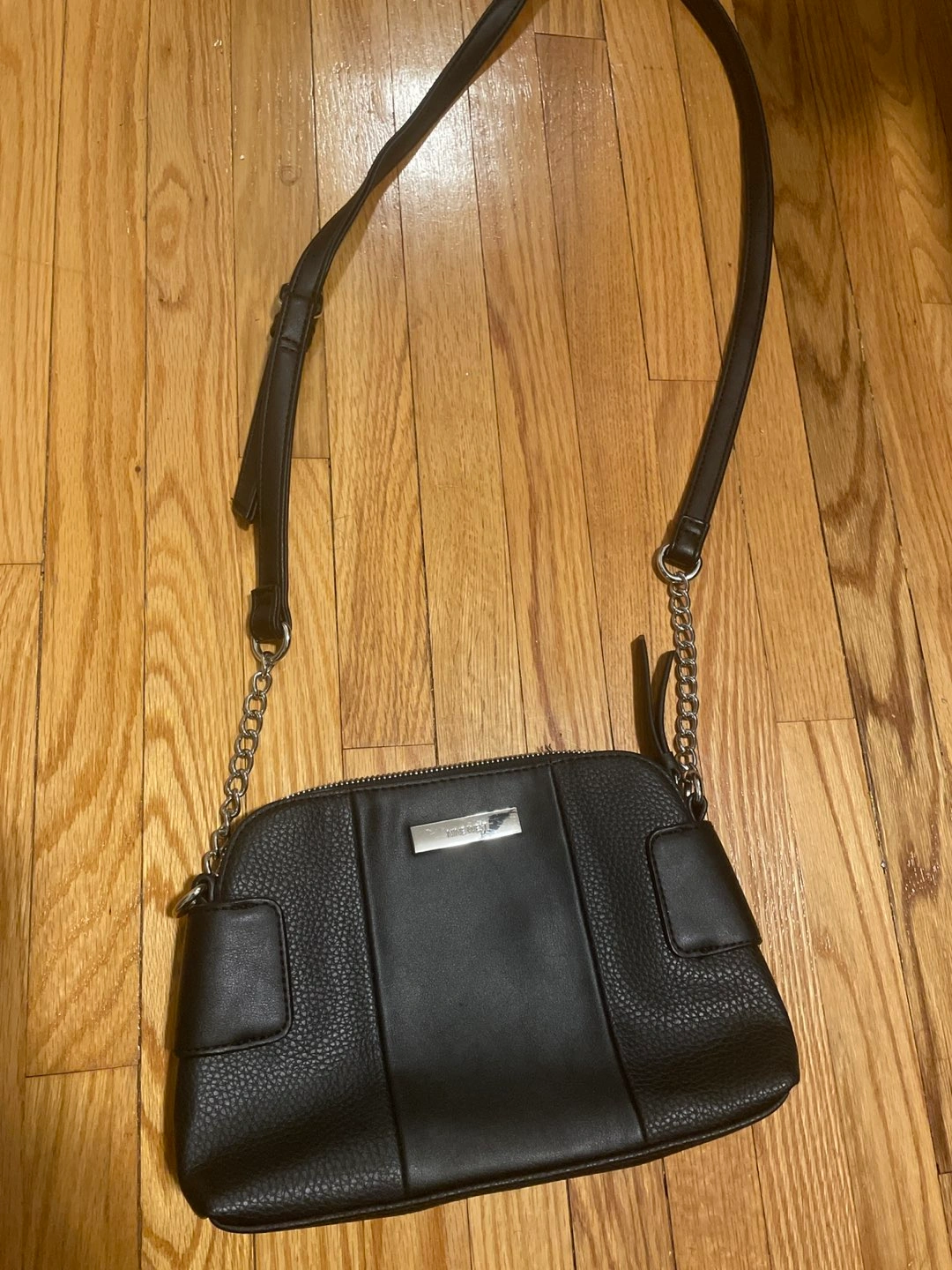 Hardly used, in great condition. Black faux leather with silver hardware. Adjustable strap and perfect size for wallet, phone, etc.