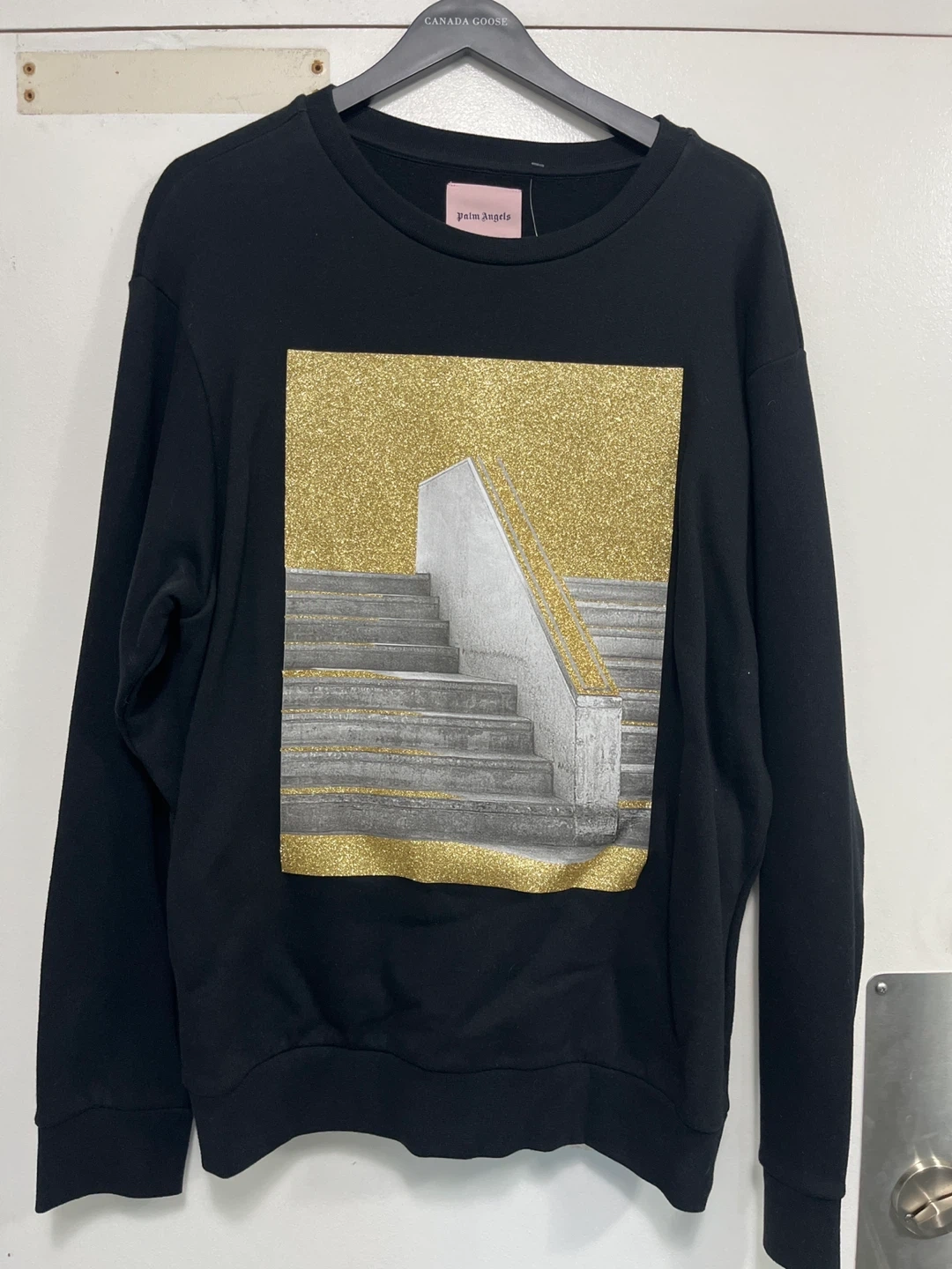 Selling a new Palm Angels crewneck sweatshirt in black. It features a unique staircase design with gold glitter accents. Perfect for adding a touch of style to your wardrobe! Tag says XL but fits like a medium or snug large