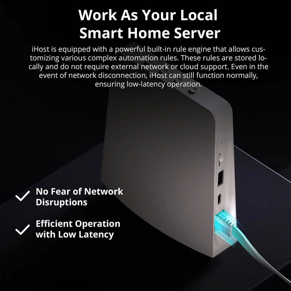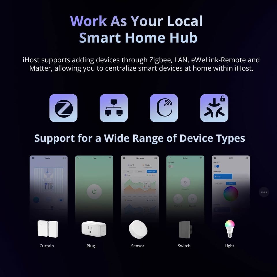 As a smart home hub, the iHost supports various wireless communication protocols, including Wi-Fi and Zigbee, allowing you to connect and control a diverse range of smart devices. It acts as a bridge between your devices and your smartphone or tablet, enabling you to control and manage your smart home system from anywhere using the SONOFF app.