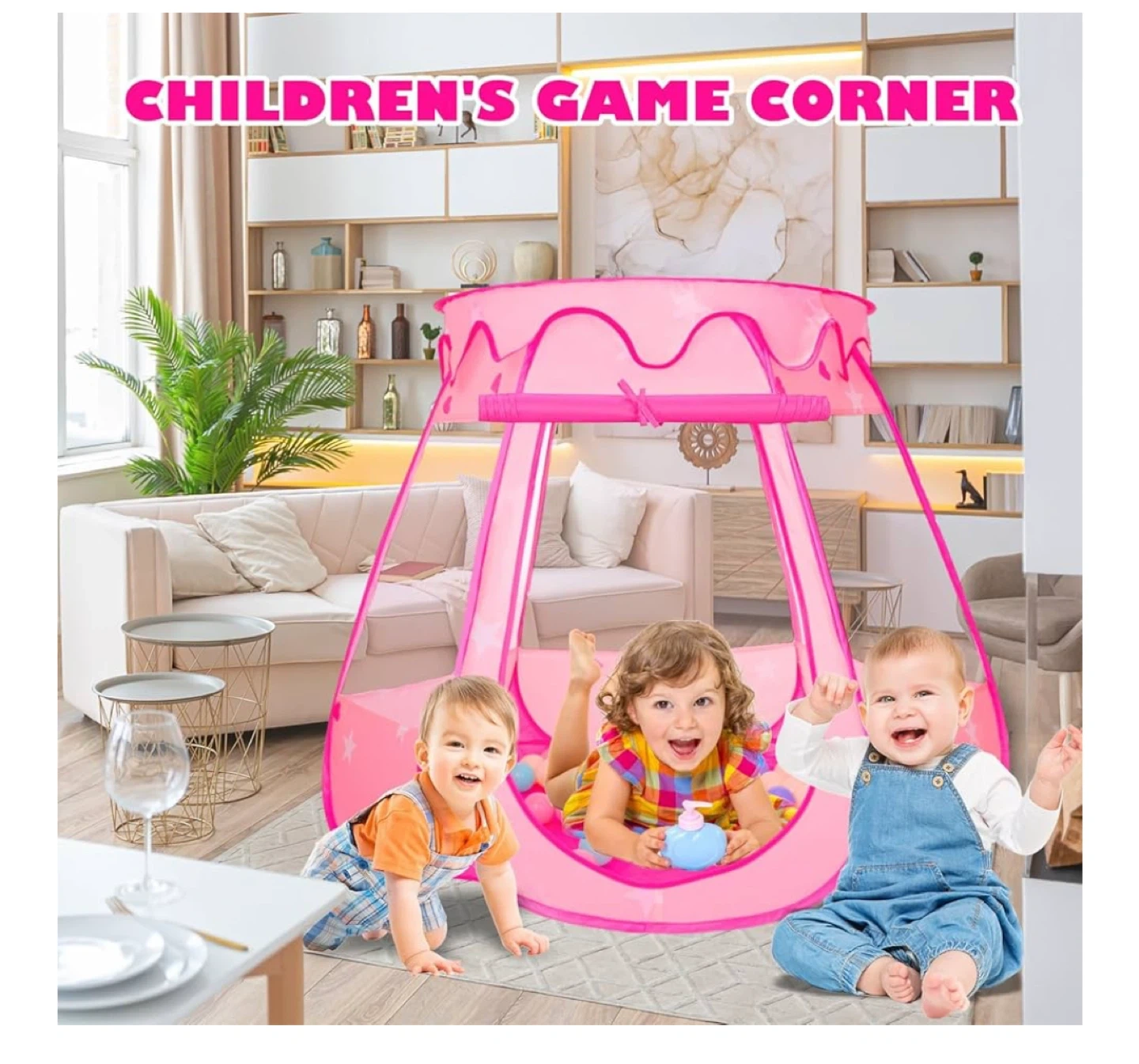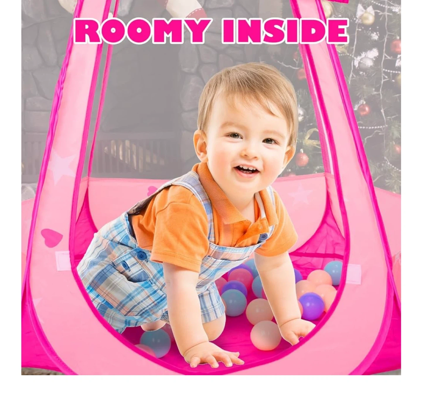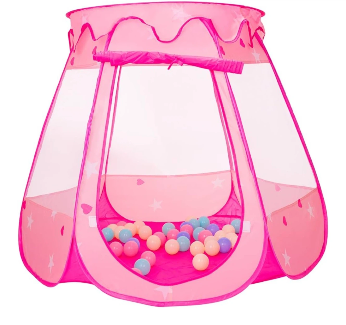 A cute pink play tent for children with colourful balls! Perfect for indoor or outdoor fun, it's roomy inside and easy to set up. The tent comes with its original box.