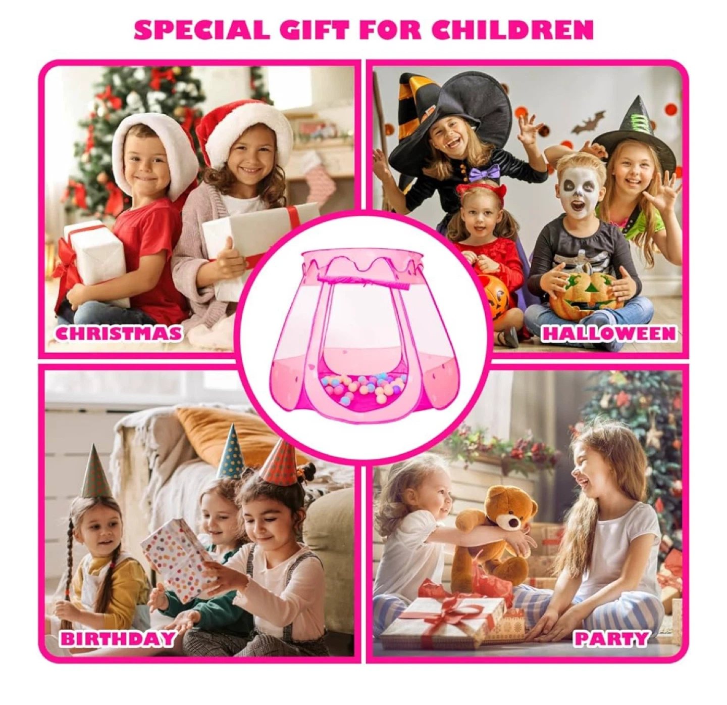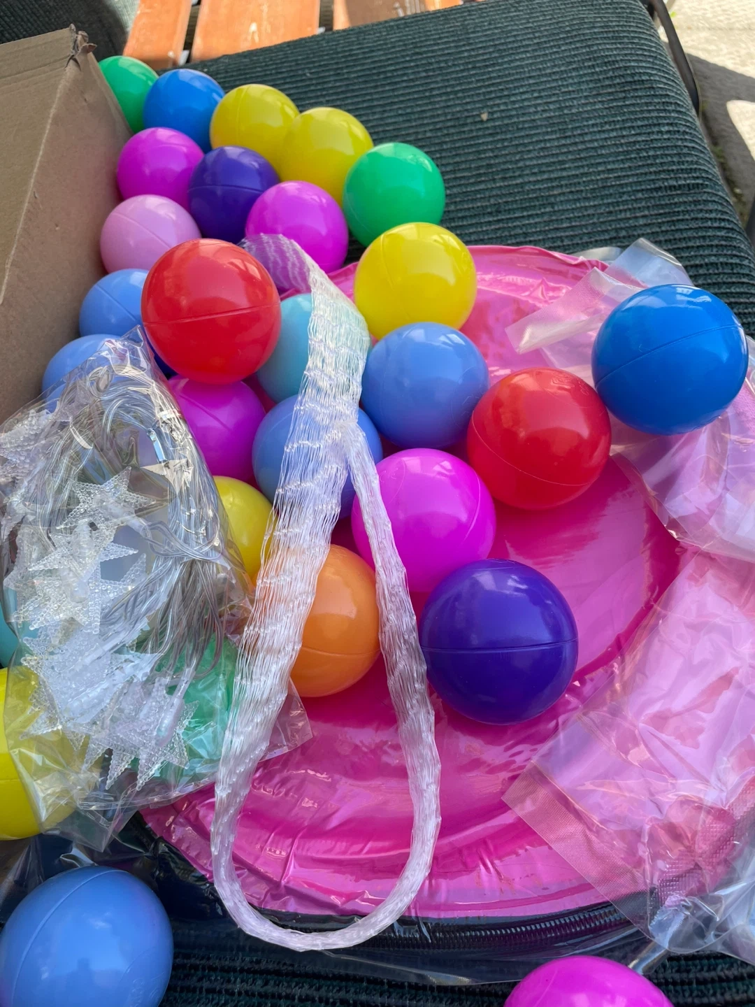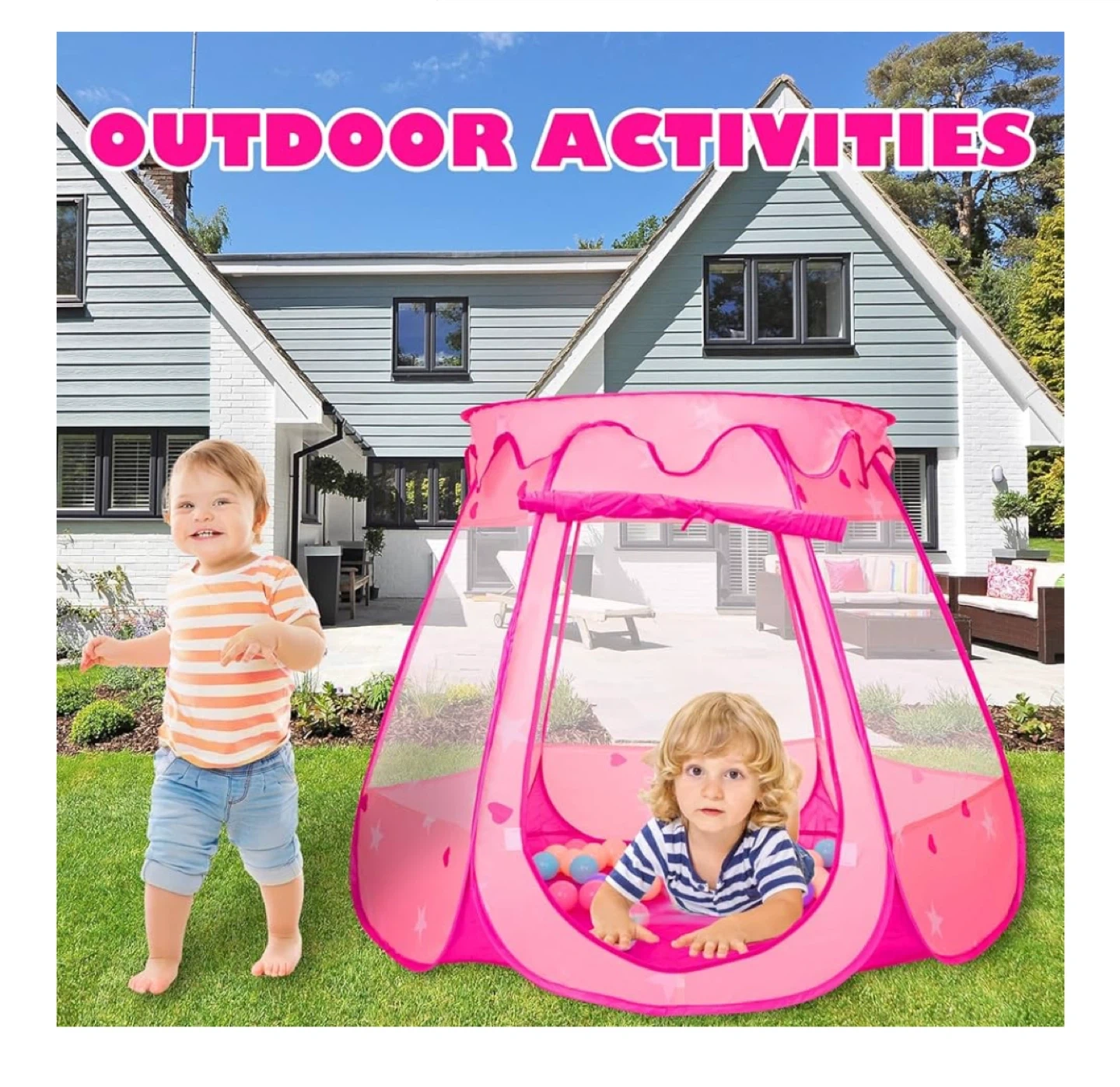 A cute pink play tent for children with colourful balls! Perfect for indoor or outdoor fun, it's roomy inside and easy to set up. The tent comes with its original box.