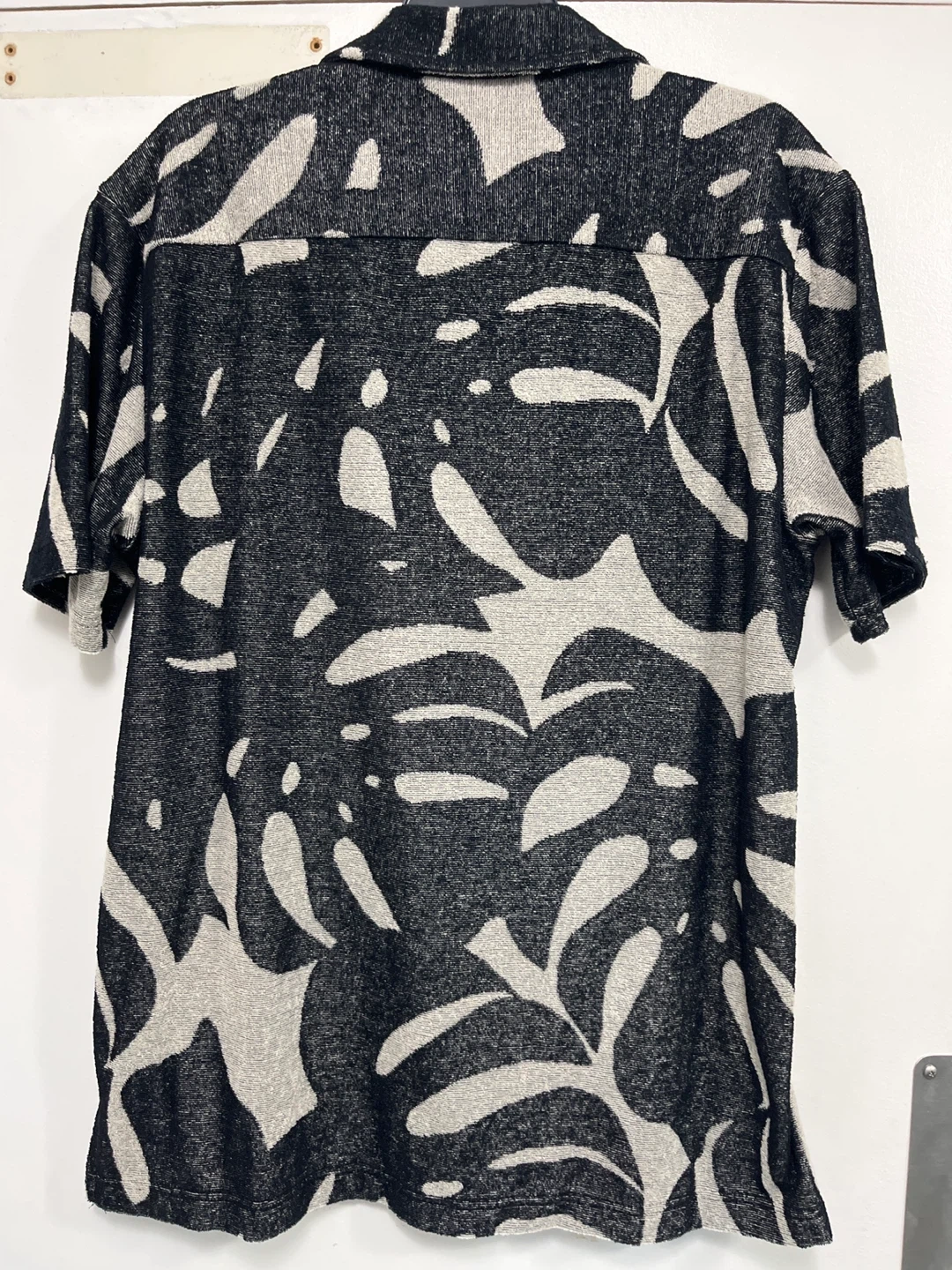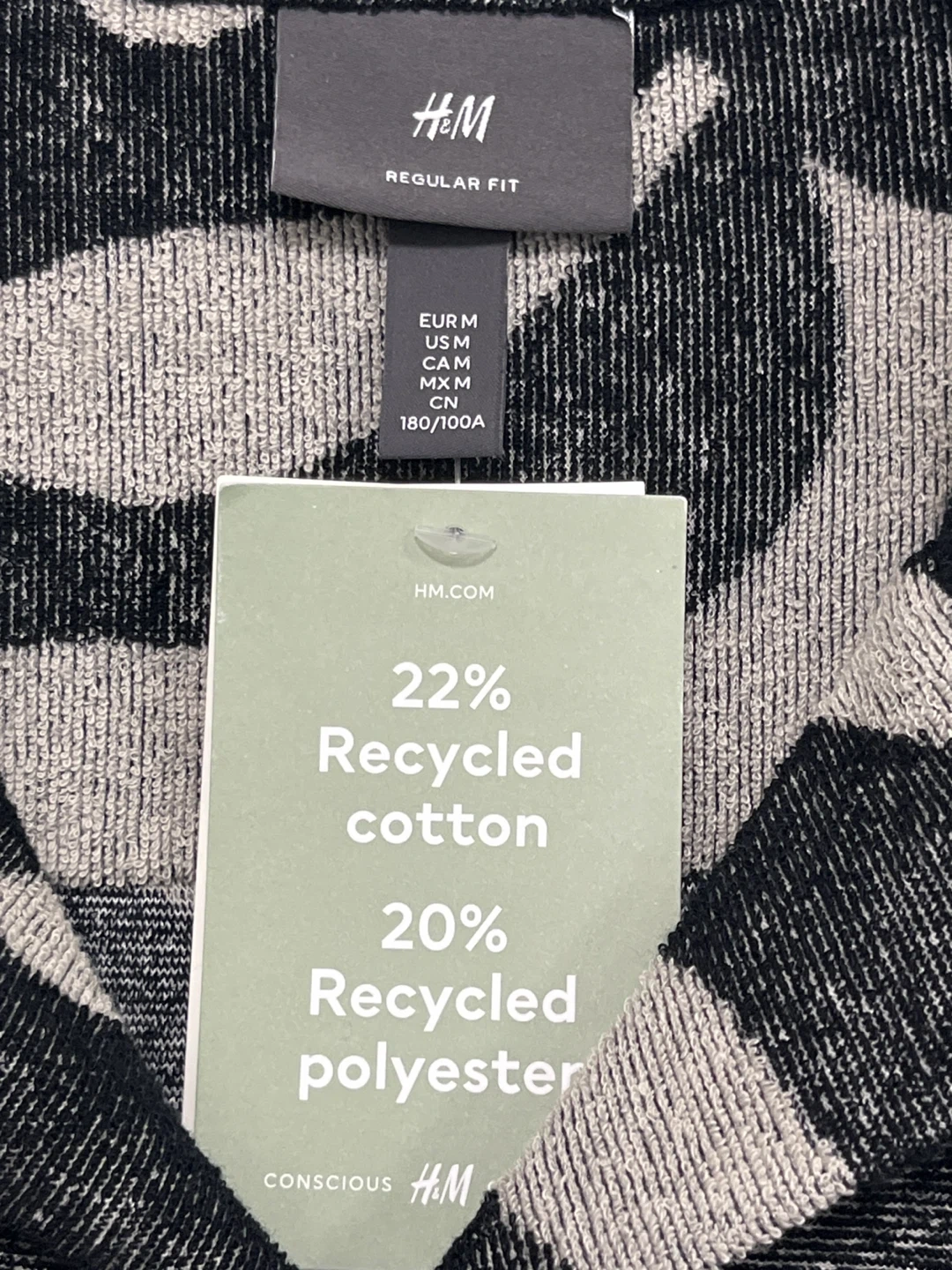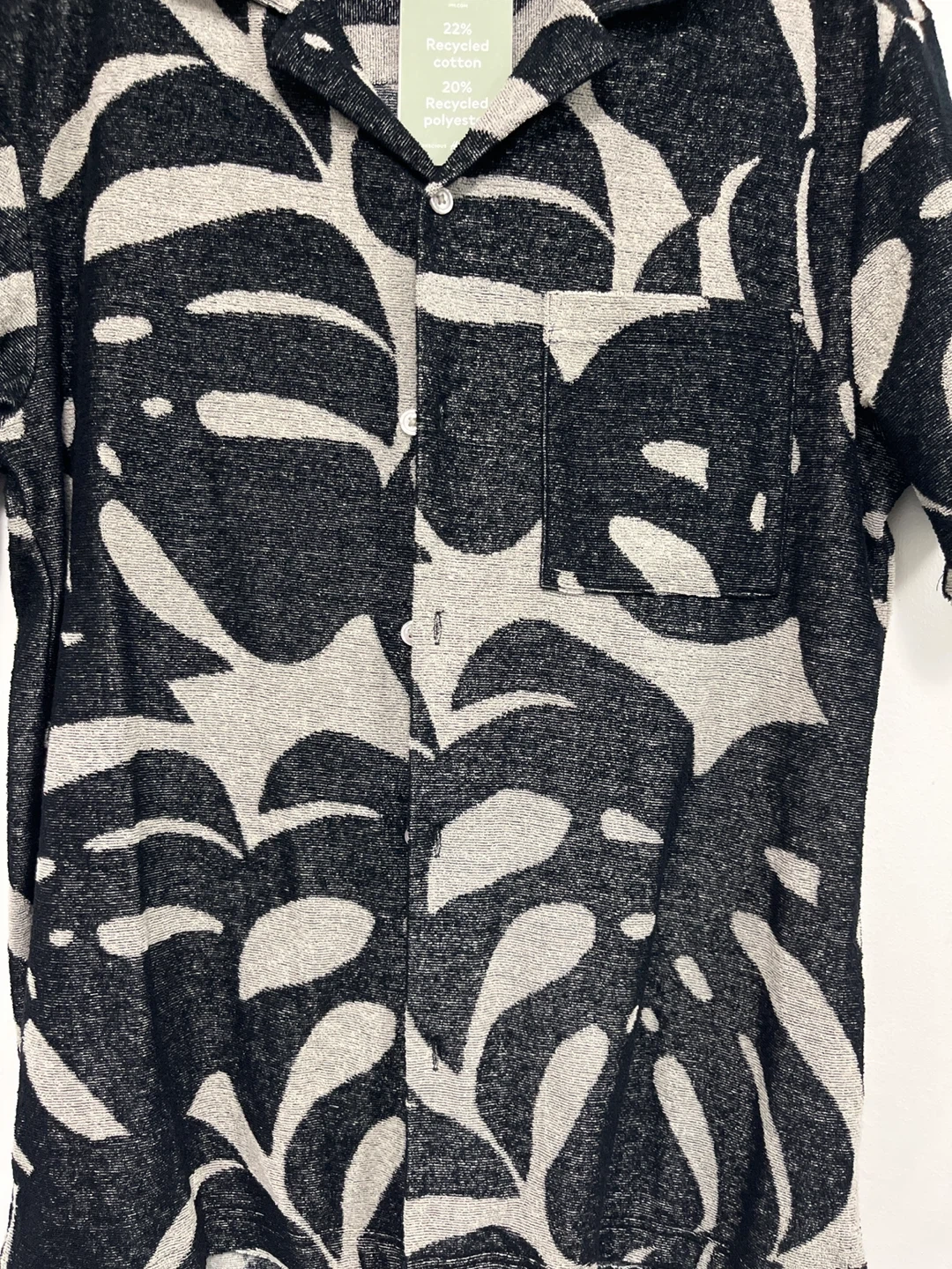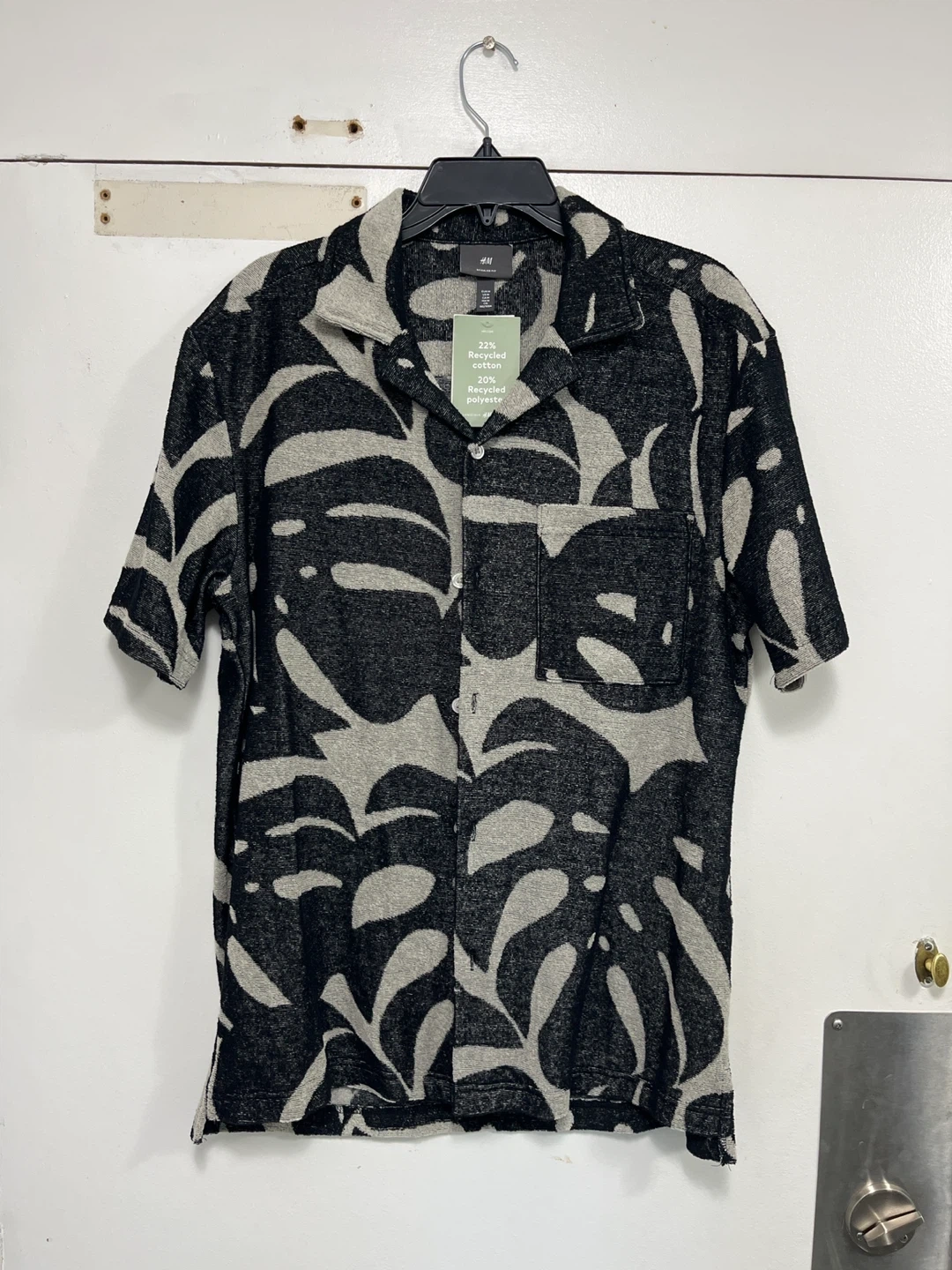 H&M regular fit shirt in size M. It features a black and white leaf pattern. Made with 22% recycled cotton and 20% recycled polyester, it's a conscious choice!