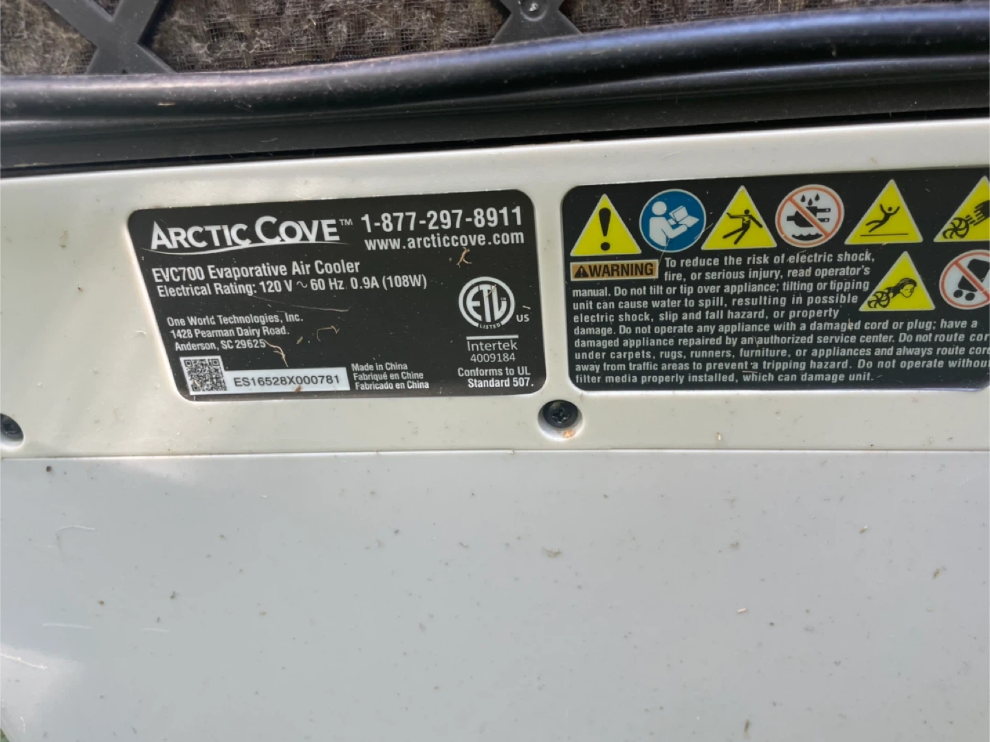 Selling an Arctic Cove EVC700 evaporative air cooler. It has an electrical rating of 120 V ~ 60 Hz 0.9A (108W). Great for cooling down your space!