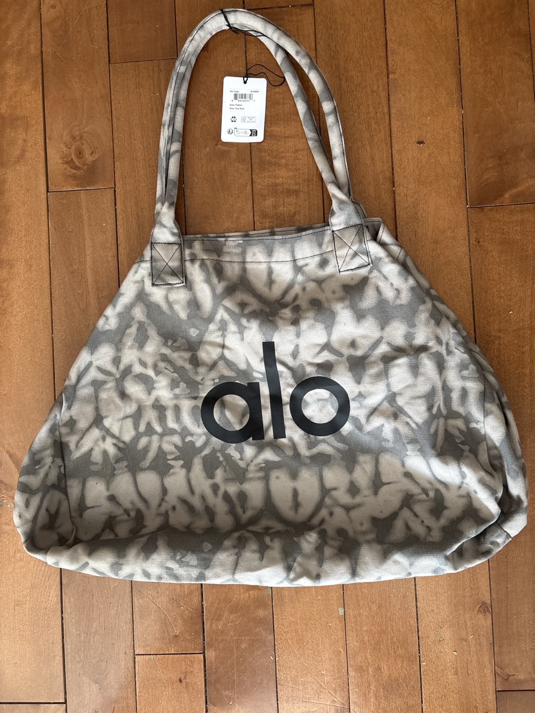 Selling an Alo Yoga tote bag with a tie dye pattern! It's in great brand new condition and perfect for carrying your yoga essentials or everyday items. The bag features the Alo logo prominently on the front. It's a stylish and functional accessory!