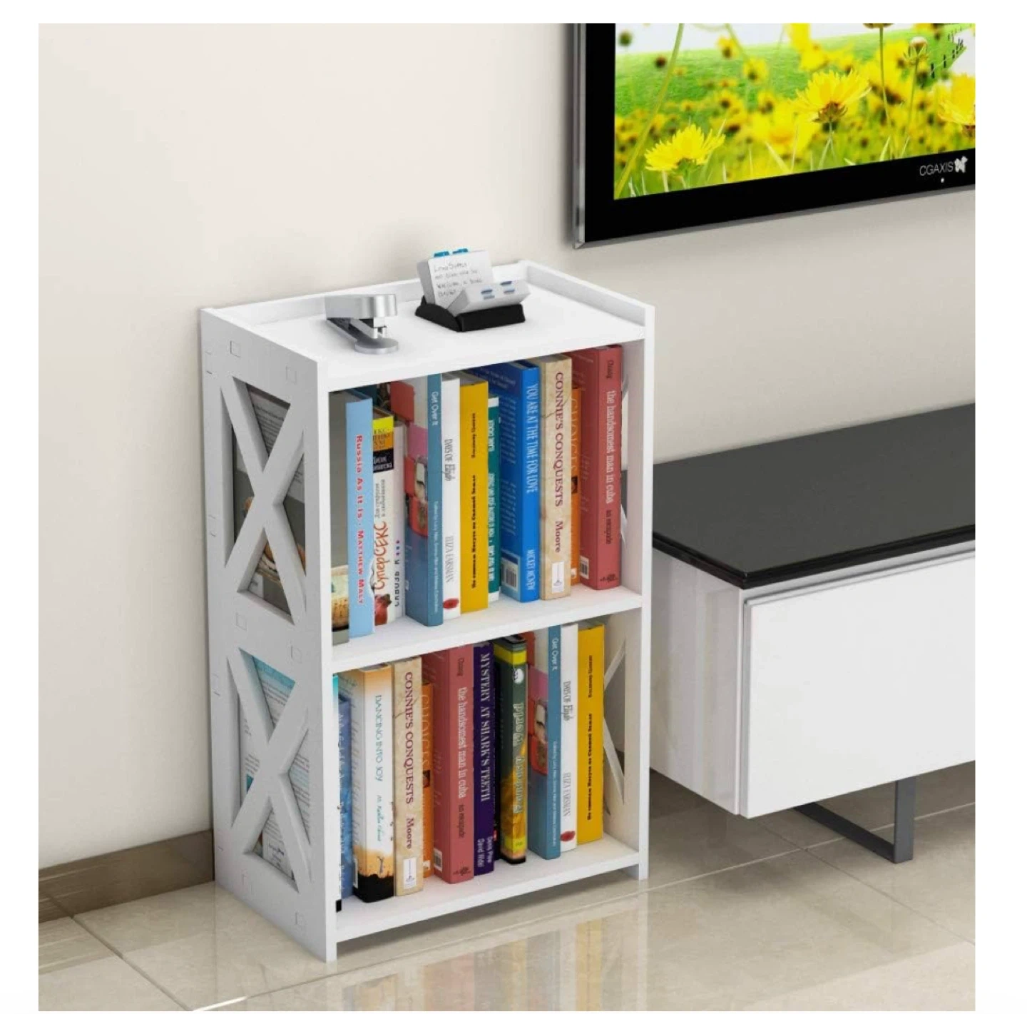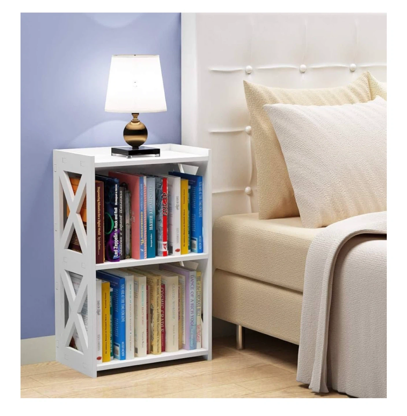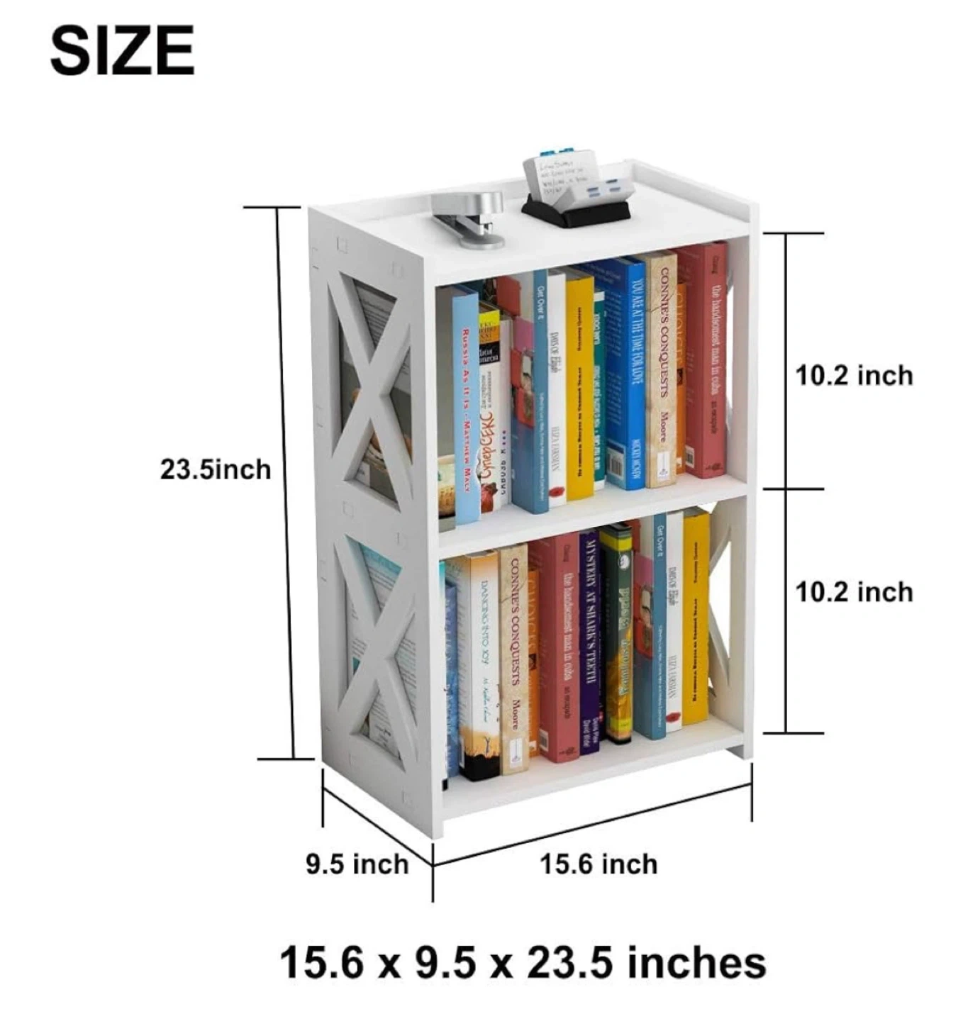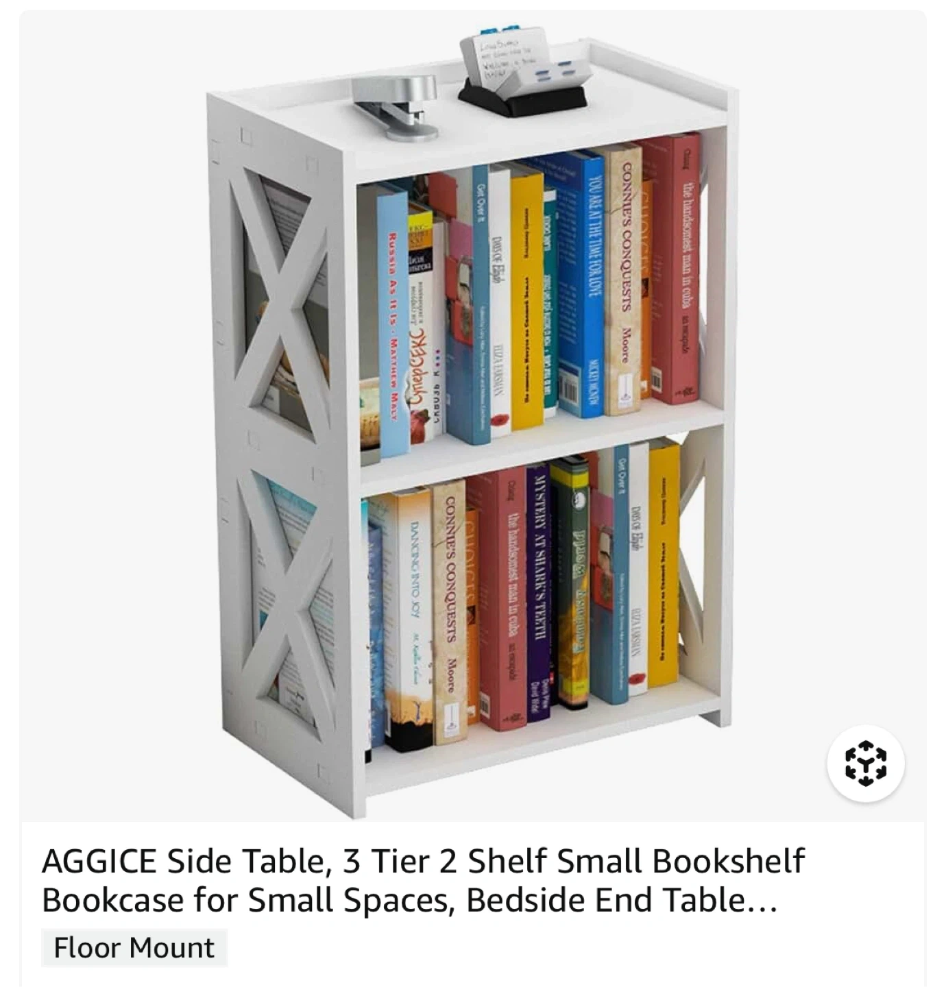 This is a cute little white bookshelf or side table, perfect for small spaces! It has 3 tiers, so there's plenty of room for books or other items. The dimensions are 15.6 x 9.5 x 23.5 inches. It's in great shape and comes with the installation instructions