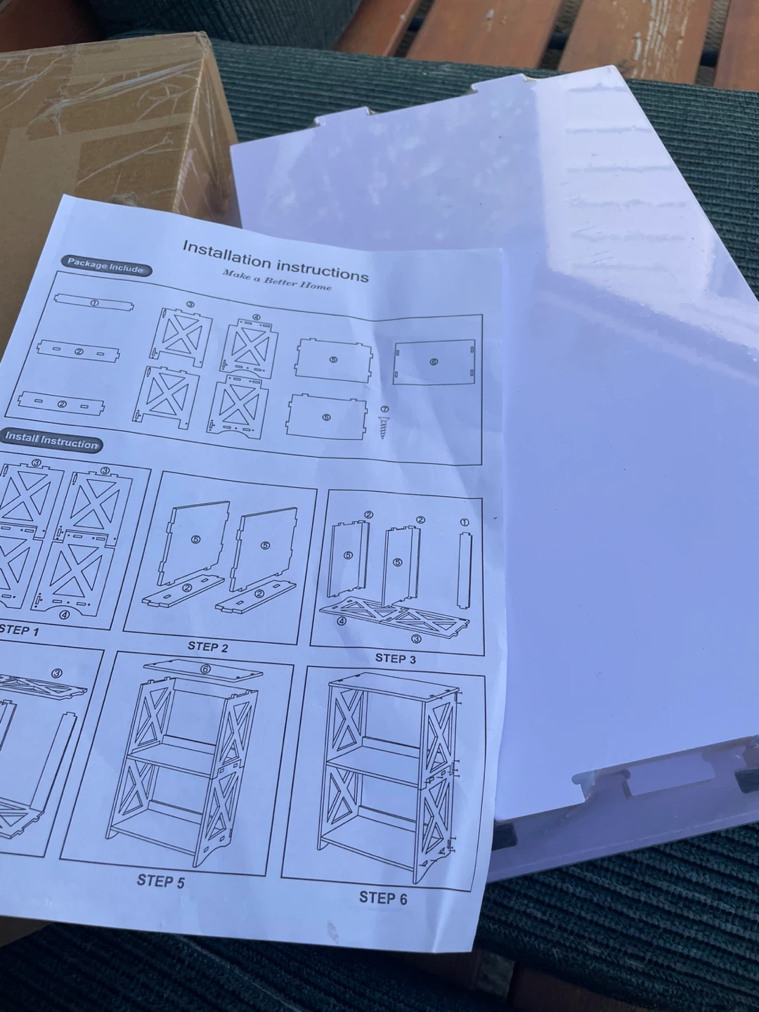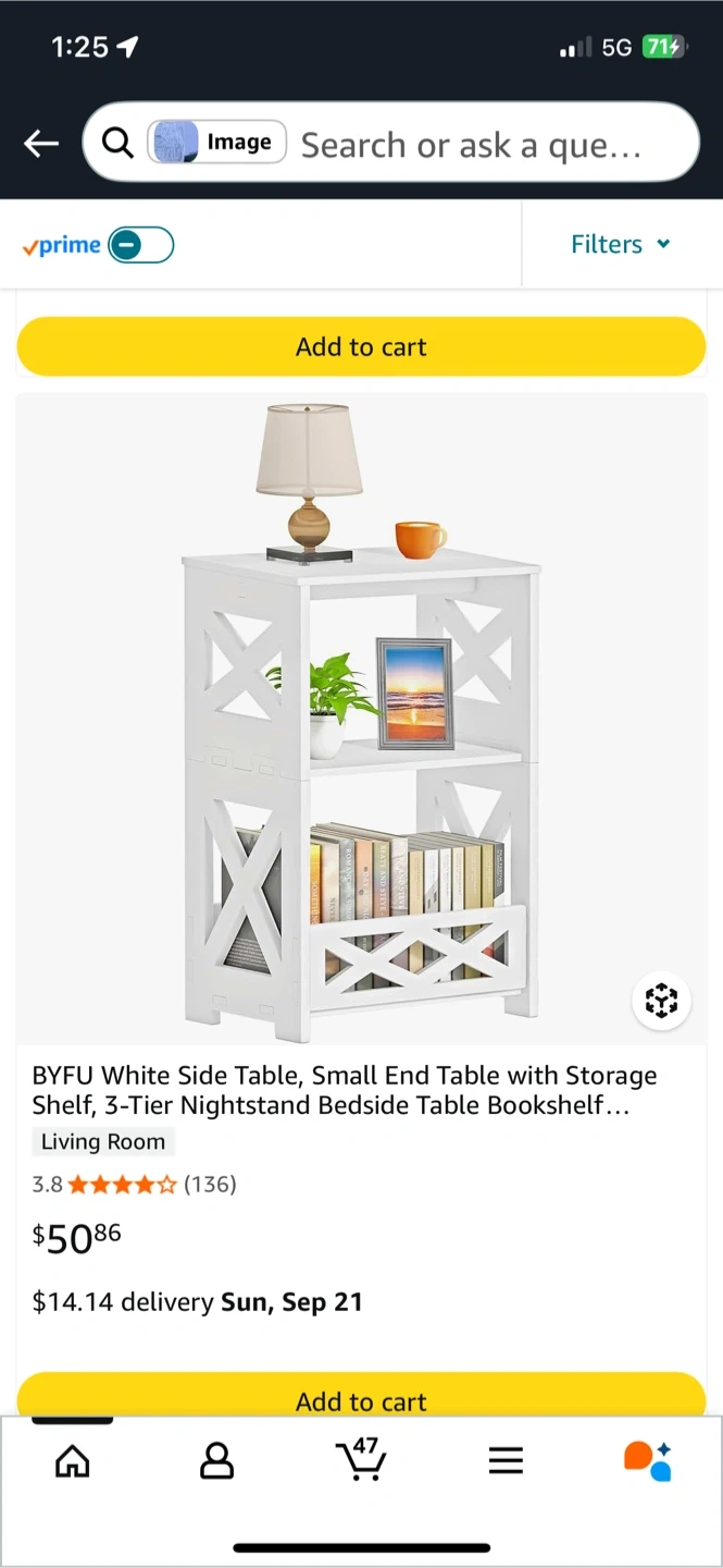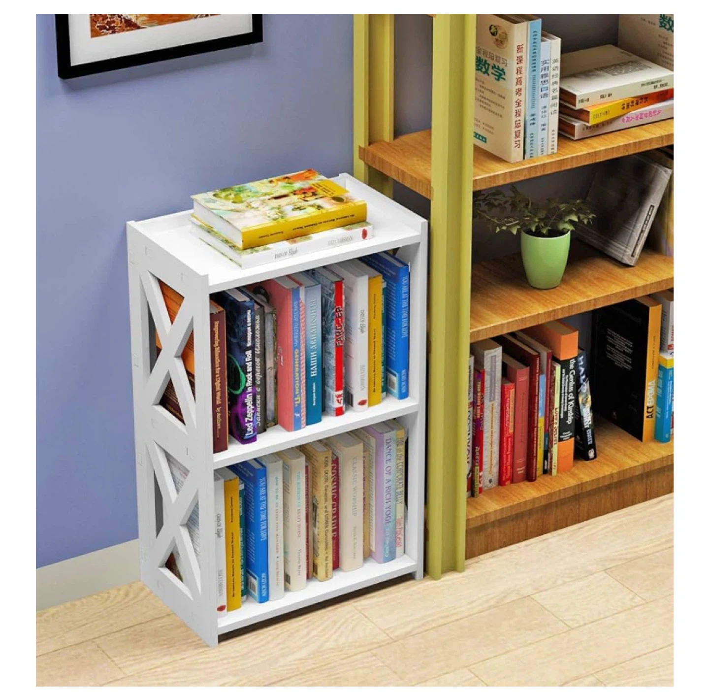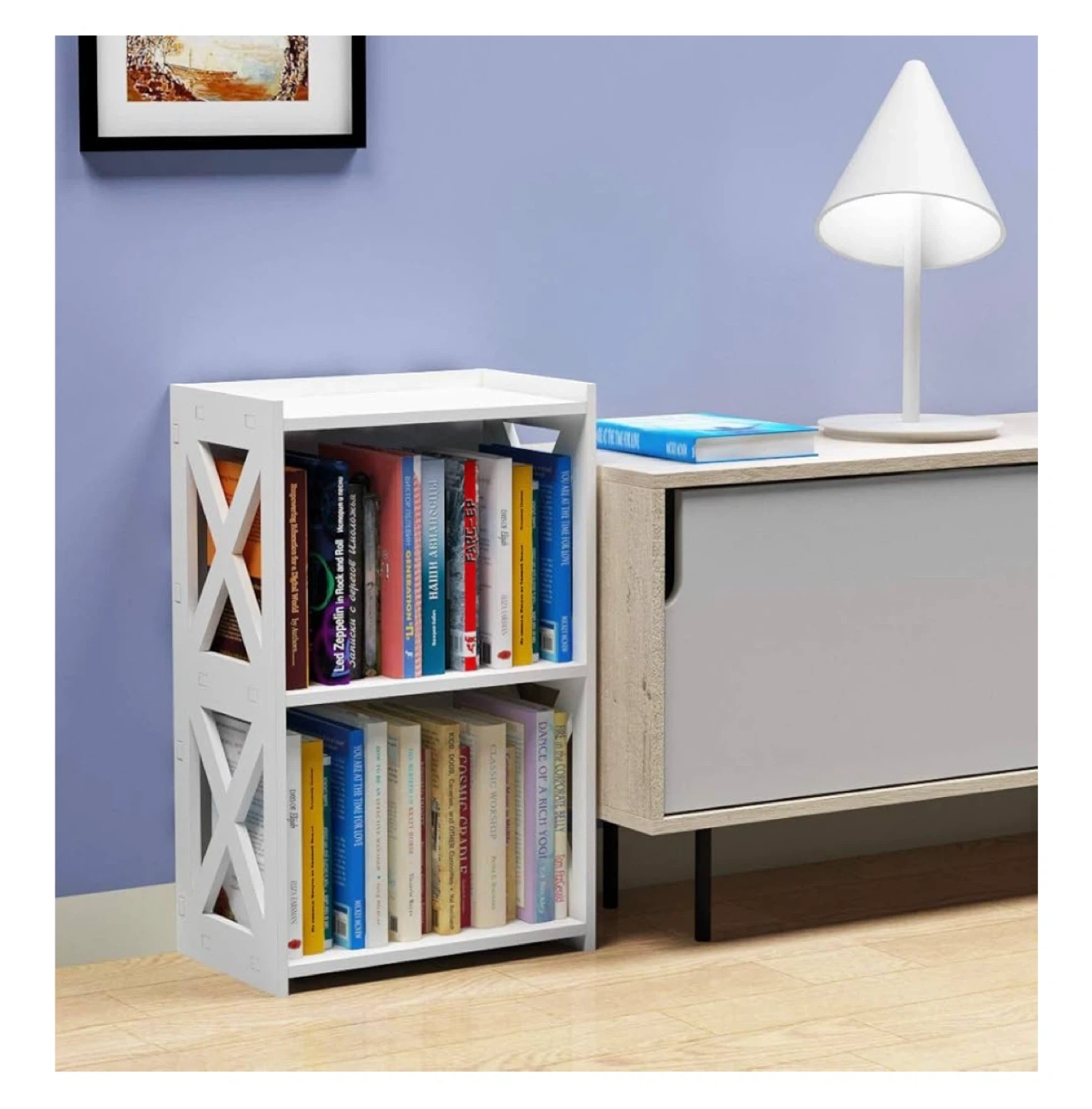 This is a cute little white bookshelf or side table, perfect for small spaces! It has 3 tiers, so there's plenty of room for books or other items. The dimensions are 15.6 x 9.5 x 23.5 inches. It's in great shape and comes with the installation instructions