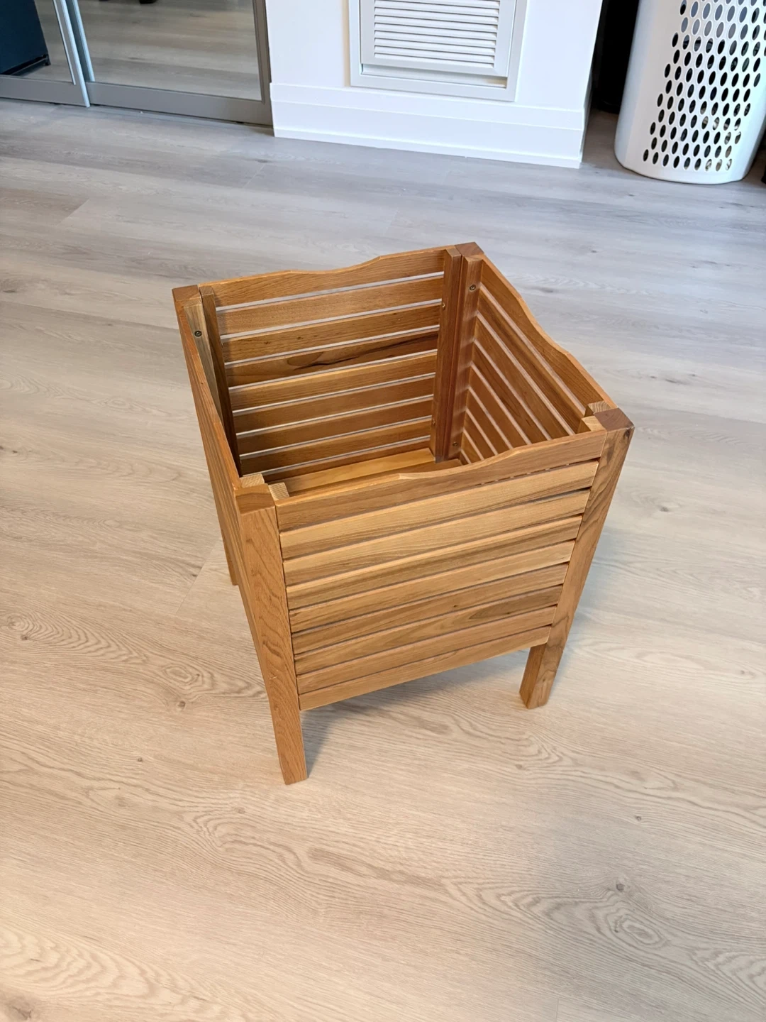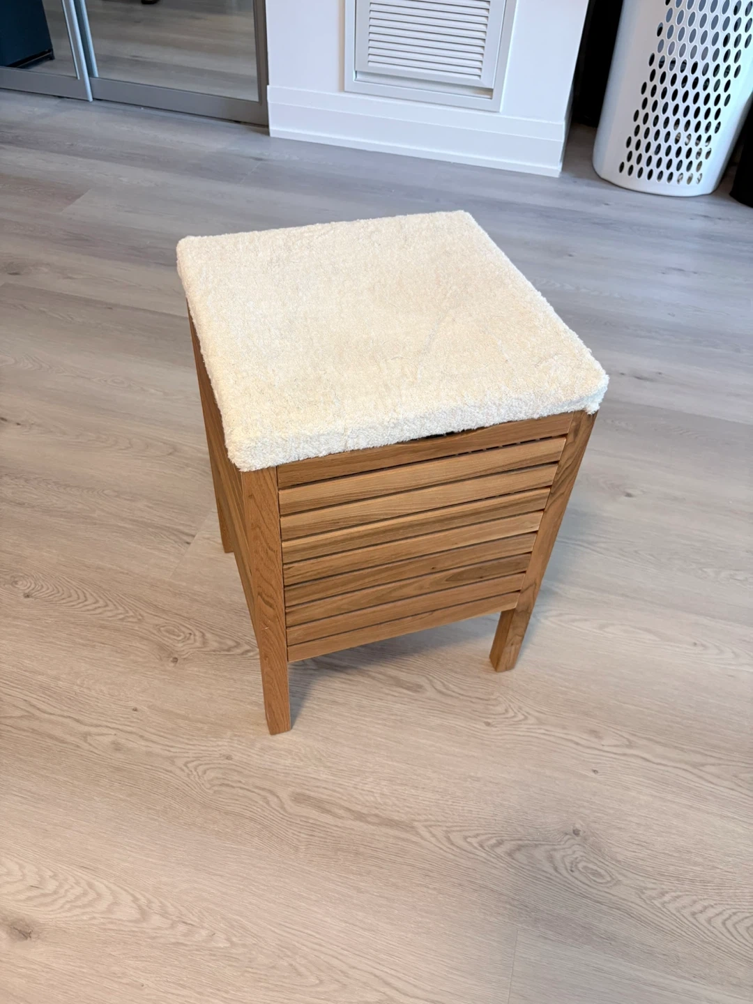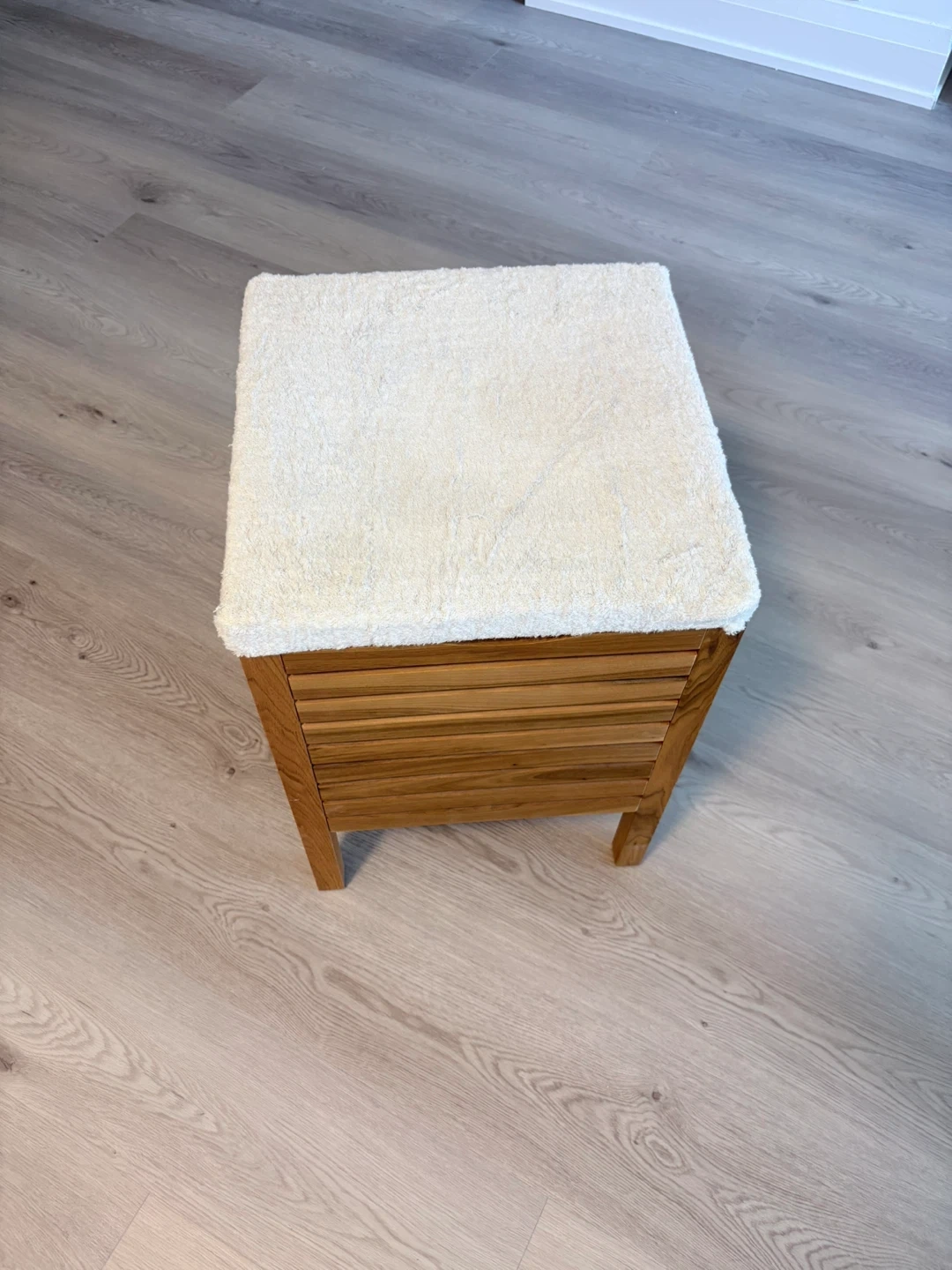 Wooden storage bench with a washable top. It's perfect for adding extra storage or to be used as a laundry basket - It's in great condition - Dimensions are 15”x15”x21.5”