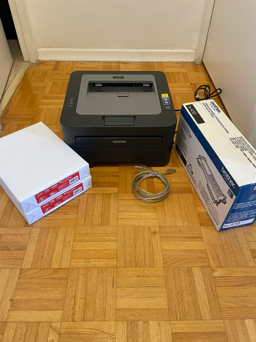 It's in great condition and comes with a replacement toner cartridge (TN-450) and 2 packs of Staples copy paper (8.5 x 11 inches).