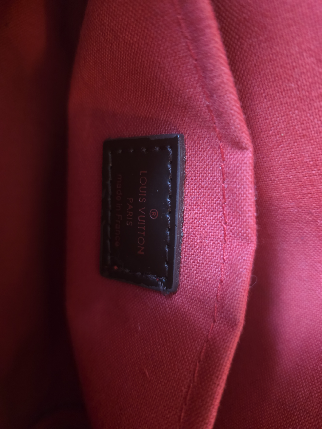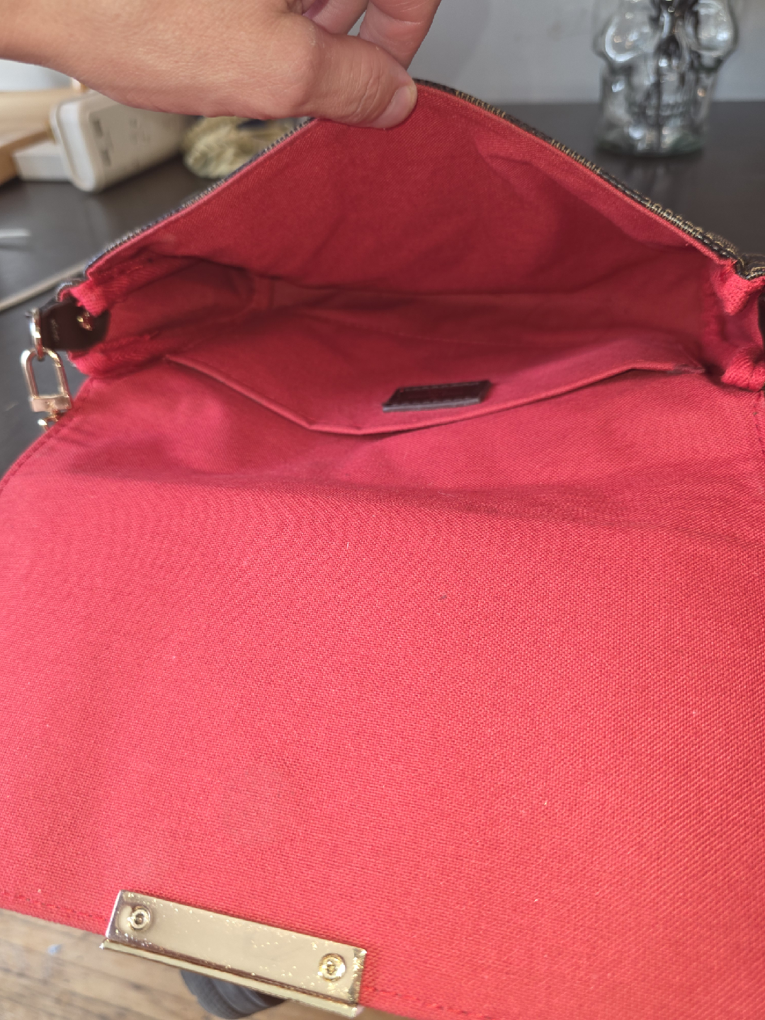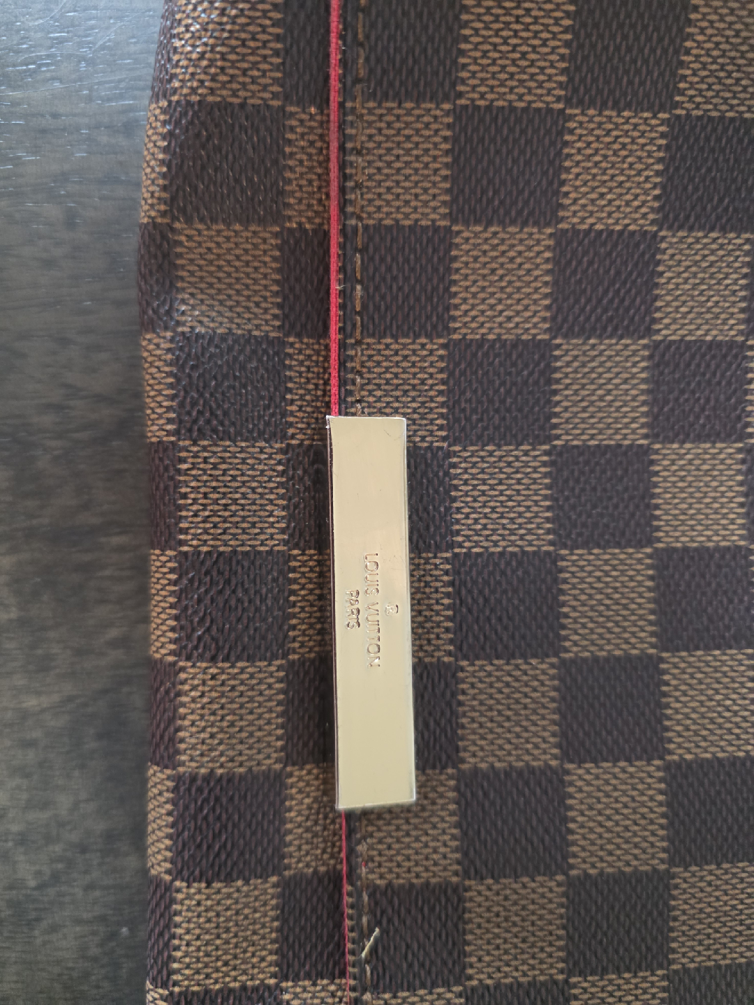 . Model Identification Brand: Louis Vuitton Style: Favorite MM Line: Damier Ebene canvas Interior: Rouge (red) microfiber lining Hardware: Gold-toned clasp with “Louis Vuitton” engraving Date Code: AA3009 → Made in France, 30th week of 2009 For the MM size: Length: 10.6 in (27 cm) Height: 6.7 in (17 cm) Width: 1.6 in (4 cm) Strap Drop (Chain): ~7 in (18 cm) Strap Drop (Long strap, when included): ~20.5 in (52 cm)