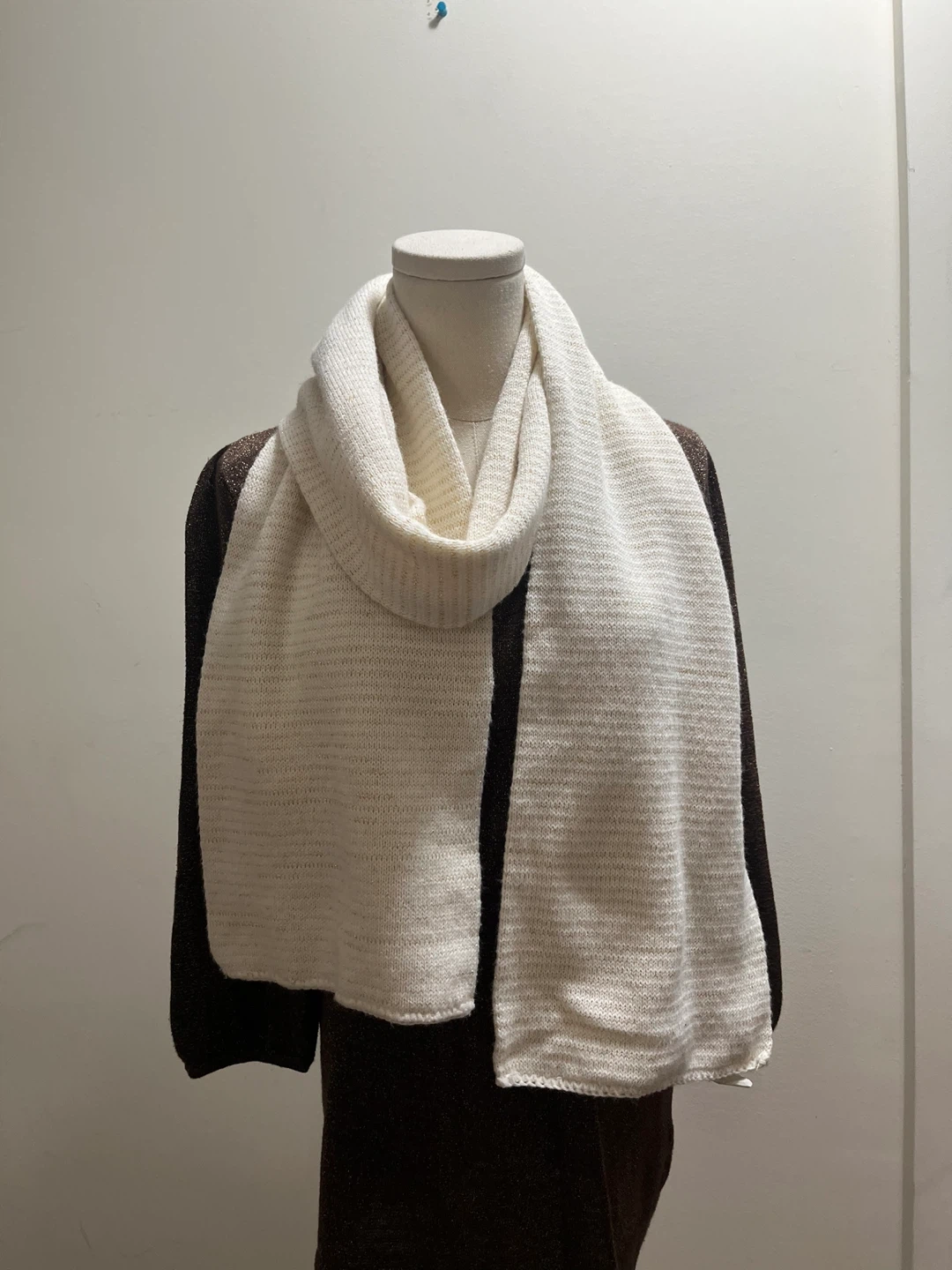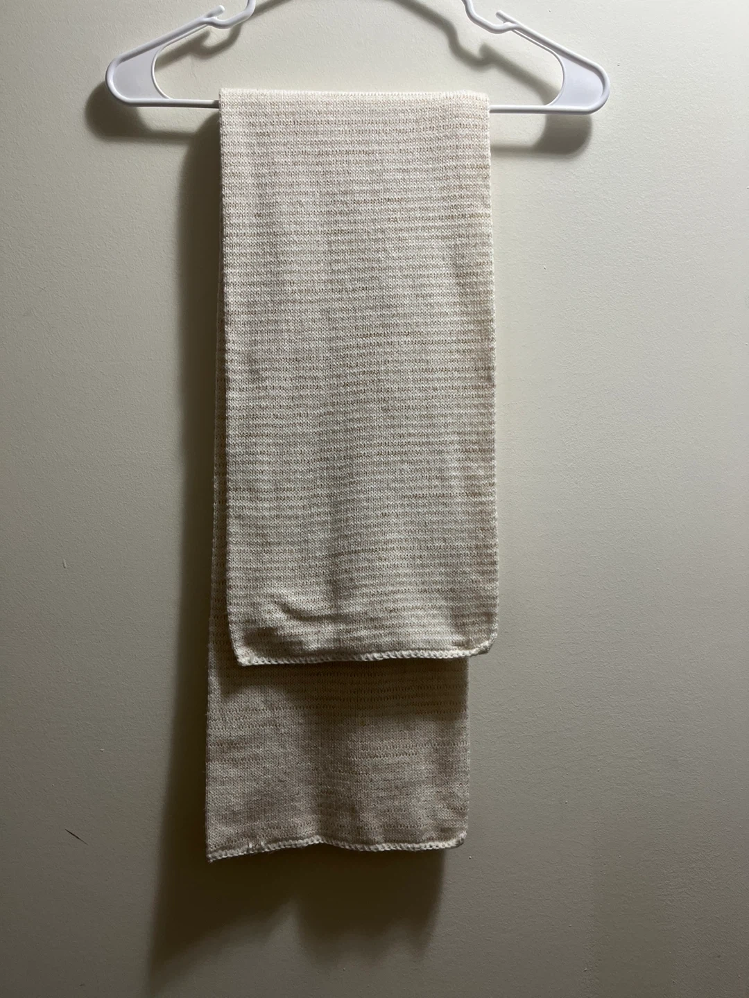 Cozy up with this lovely cream-coloured knit scarf, subtly accented with gold threads! It's in great condition and ready to add a touch of warmth and sparkle to your winter wardrobe Elegant white knit scarf with cream sparkly lines within. Perfect for chilly days. Like new condition Pickup Brampton or downtown Toronto Approximate measurements: Width 9” Length 80” 95% Acrylic 5% Polyester