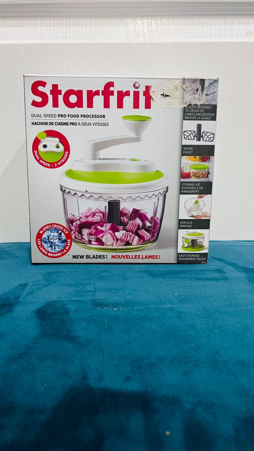 65I'm selling a brand new Starfrit Dual Speed Pro Food Processor! It features blades designed to crush ice, a whisk, a storage lid, and a spatula. It also has new blades and easy storage