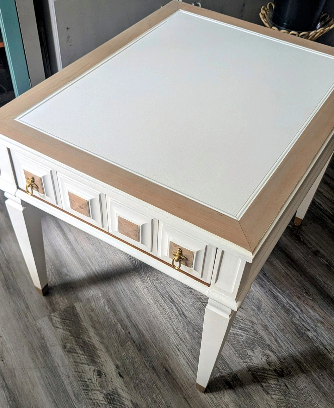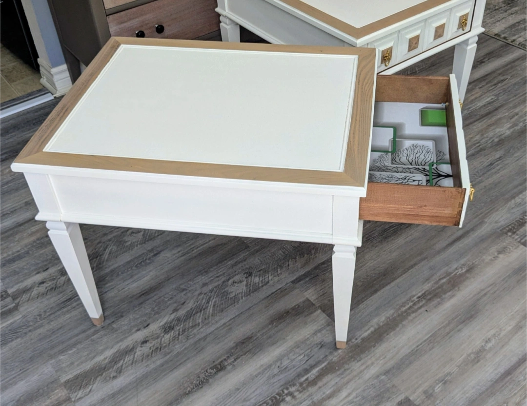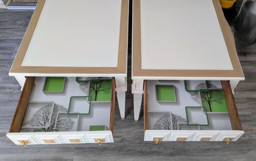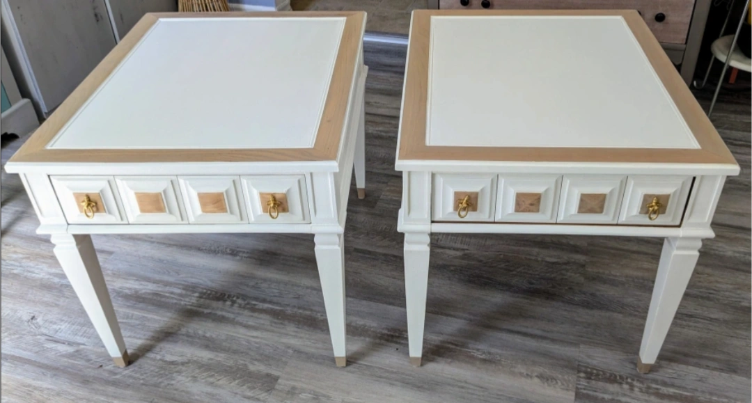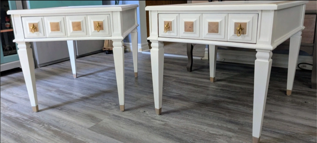 Exquisitely refinished side tables or nightstands in pristine white with wooden accents and gold handles. Sealed for enhanced durability. Drawers are lined for a touch of elegance. A sophisticated addition to any home.