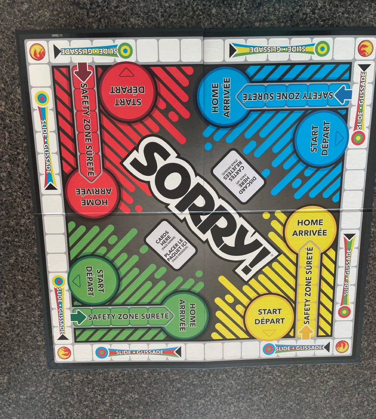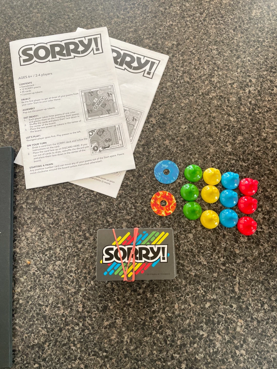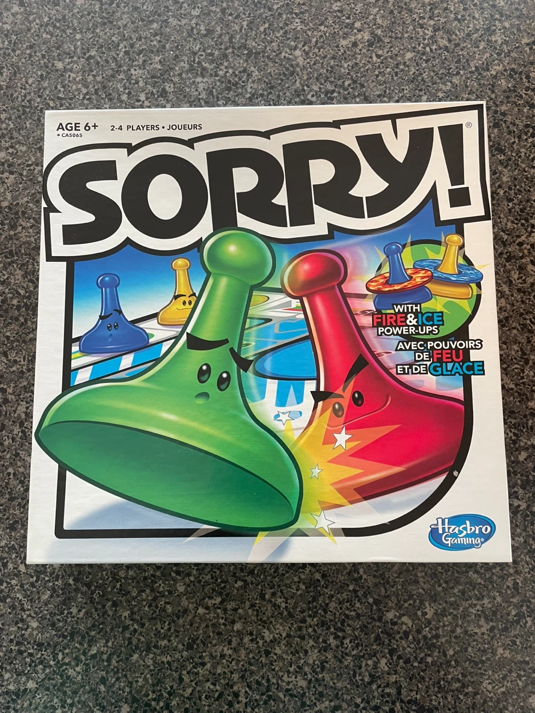 Selling a gently used Sorry! board game by Hasbro Gaming. It's suitable for ages 6+ and for 2-4 players. Includes the game board, pawns, and instructions so you're ready to play!