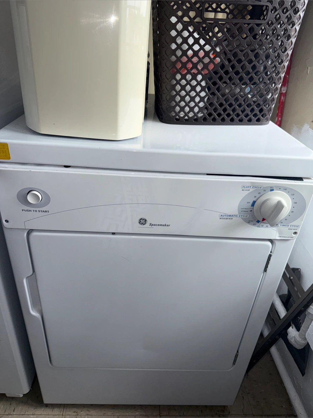 Selling a GE Spacemaker laundry dryer in white. It has a fluff cycle and automatic cycle. Perfect for smaller spaces!