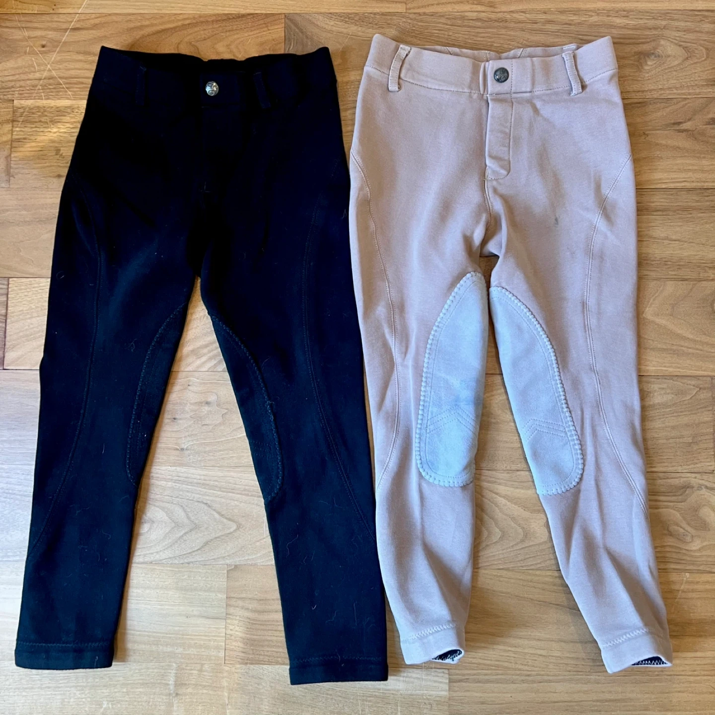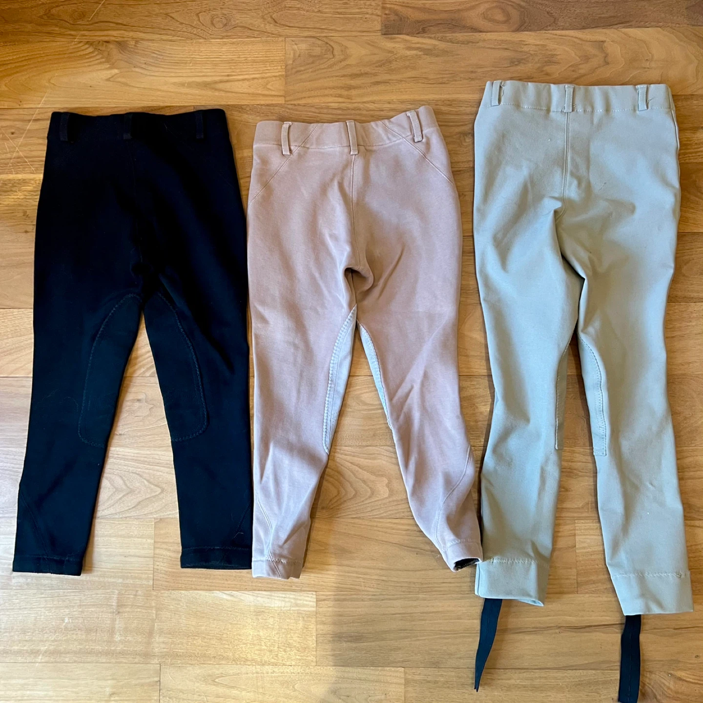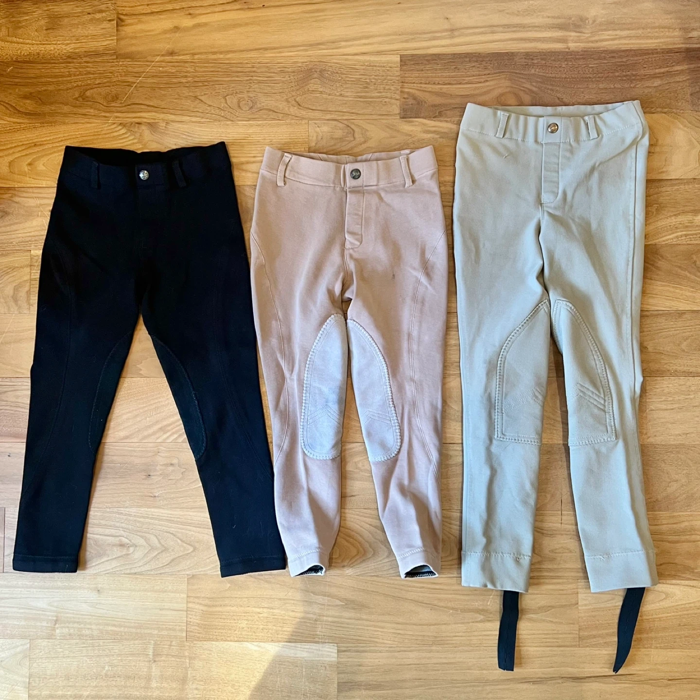 Kids riding pants, size 8 in various colours - black, beige, and tan.