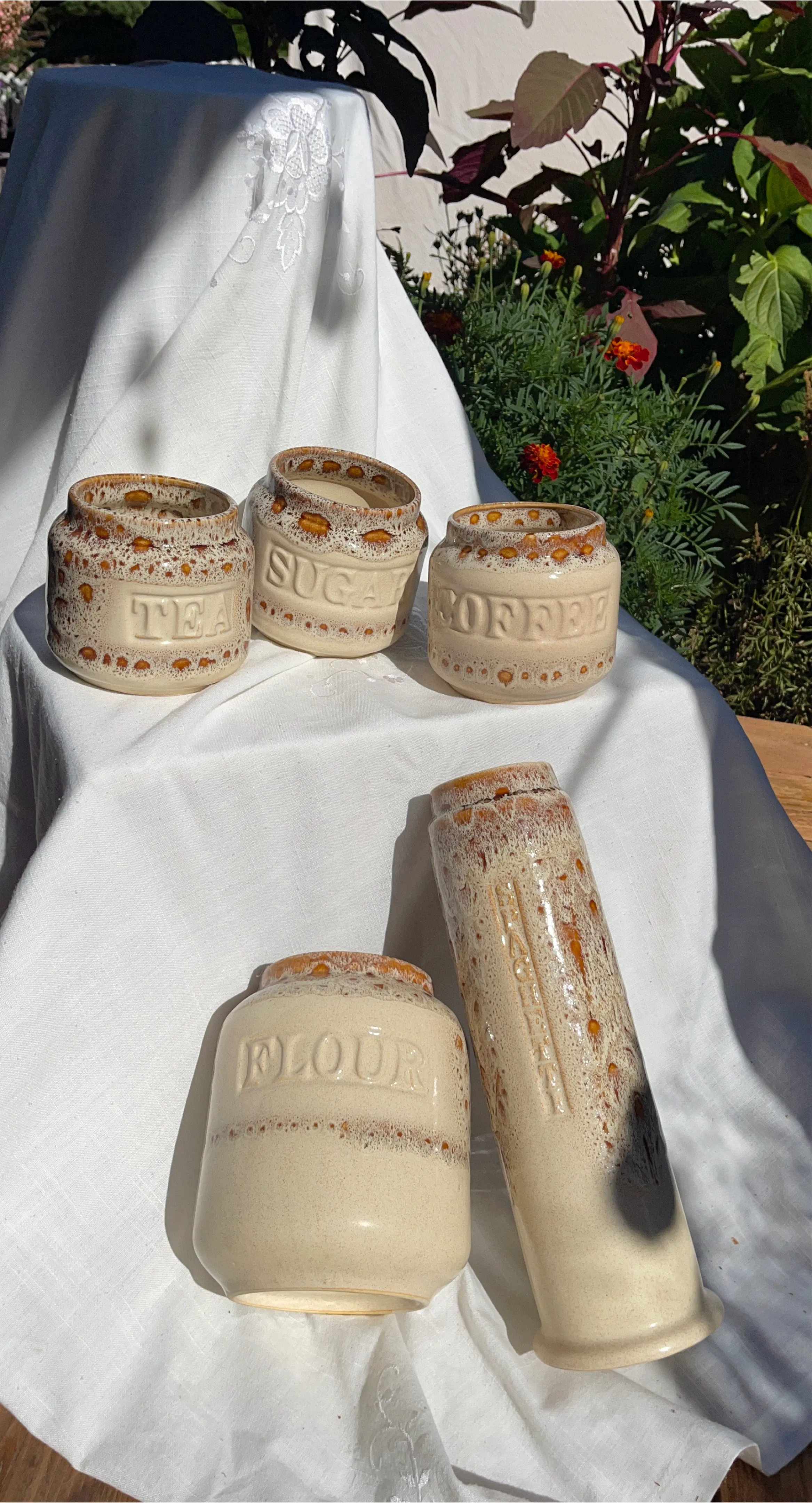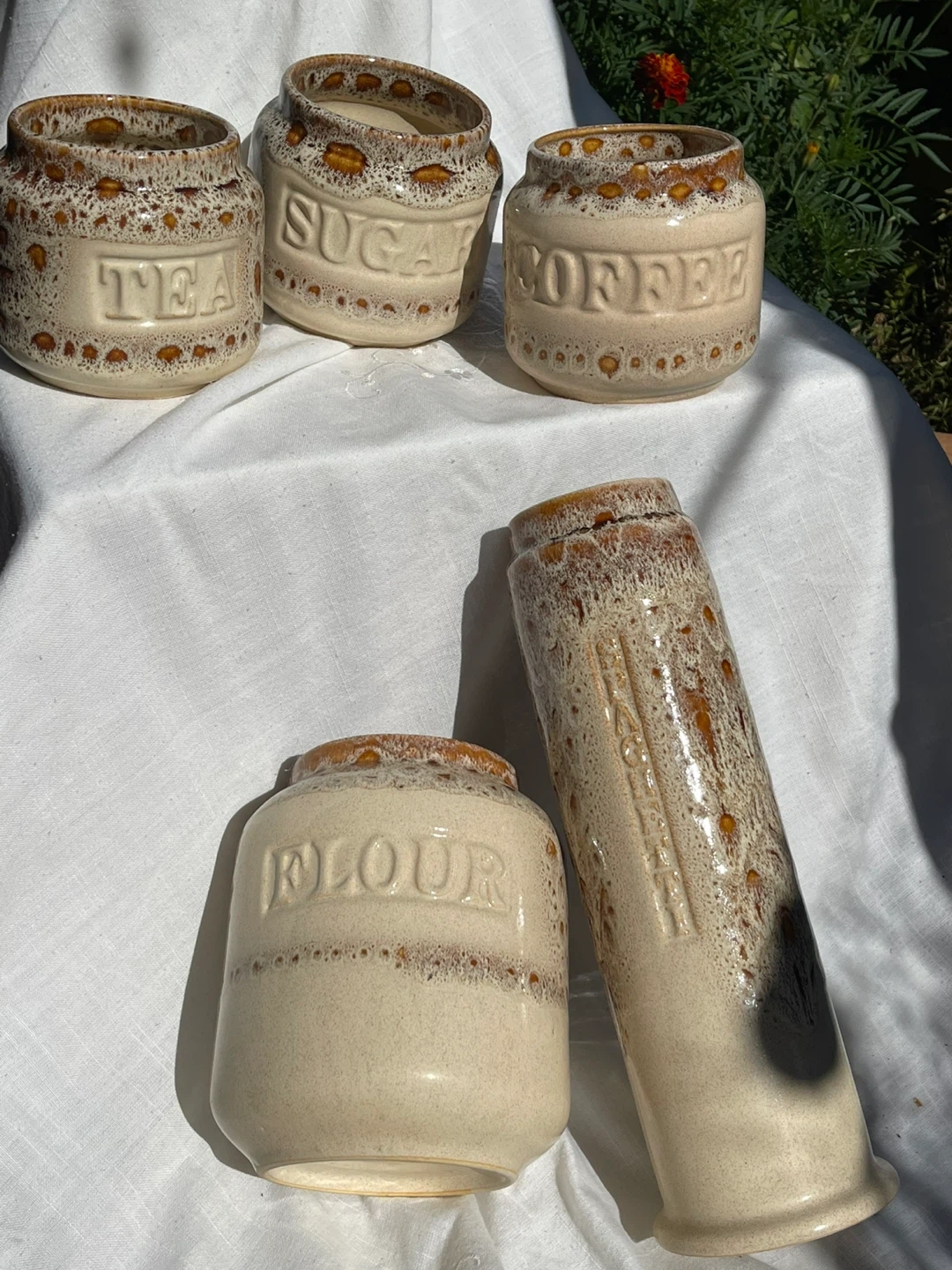Selling a charming set of Roberts oven and microwave-safe pottery canisters! Includes containers for tea, sugar, coffee, and flour, plus an extra canister. They have a lovely speckled design and would add a touch of vintage charm to any kitchen. We do have a wooden lids for an each container
