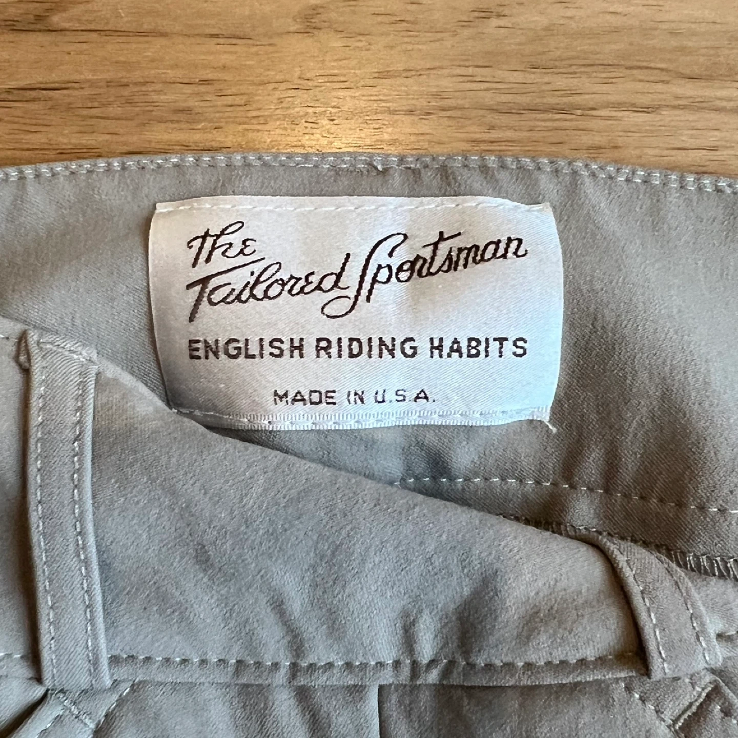 The Tailored Sportsman Trophy Hunter Riding Jod in Tan with leather knee patches, side zip closure, and elastic pants straps. They are in excellent condition and perfect for any equestrian enthusiast.