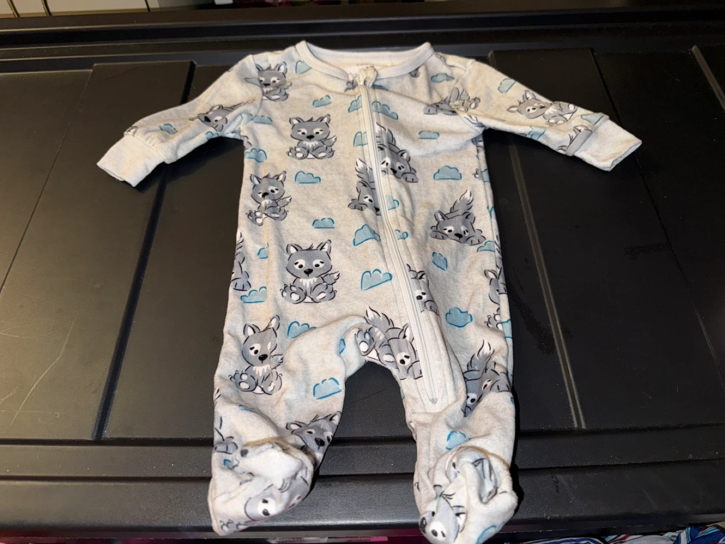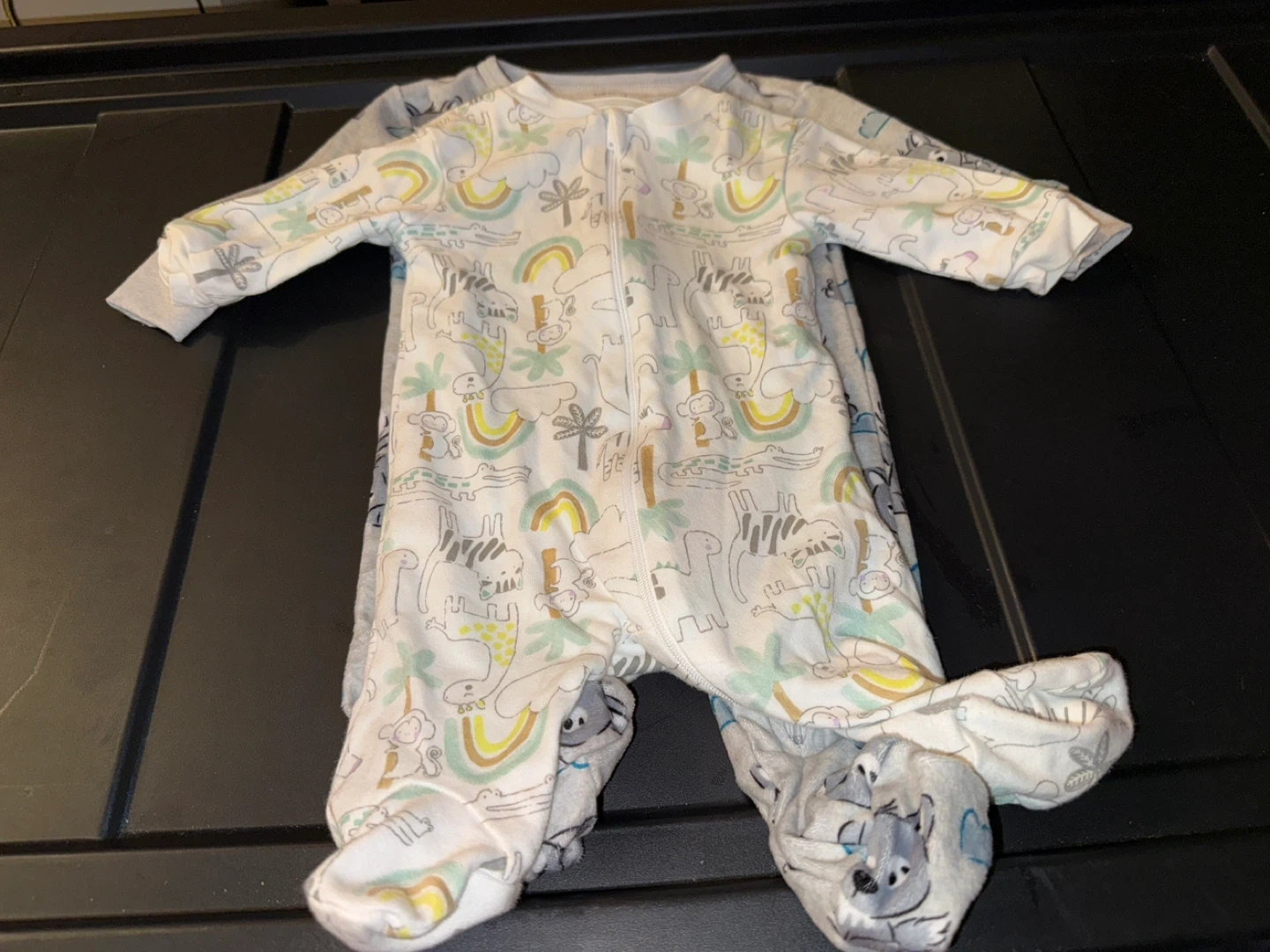 Two adorable baby sleepers in size 3-6 months. One is white with a colourful jungle print and the other is grey with cute wolf designs. Perfect for keeping your little one snug at night! Age 0-3 Months