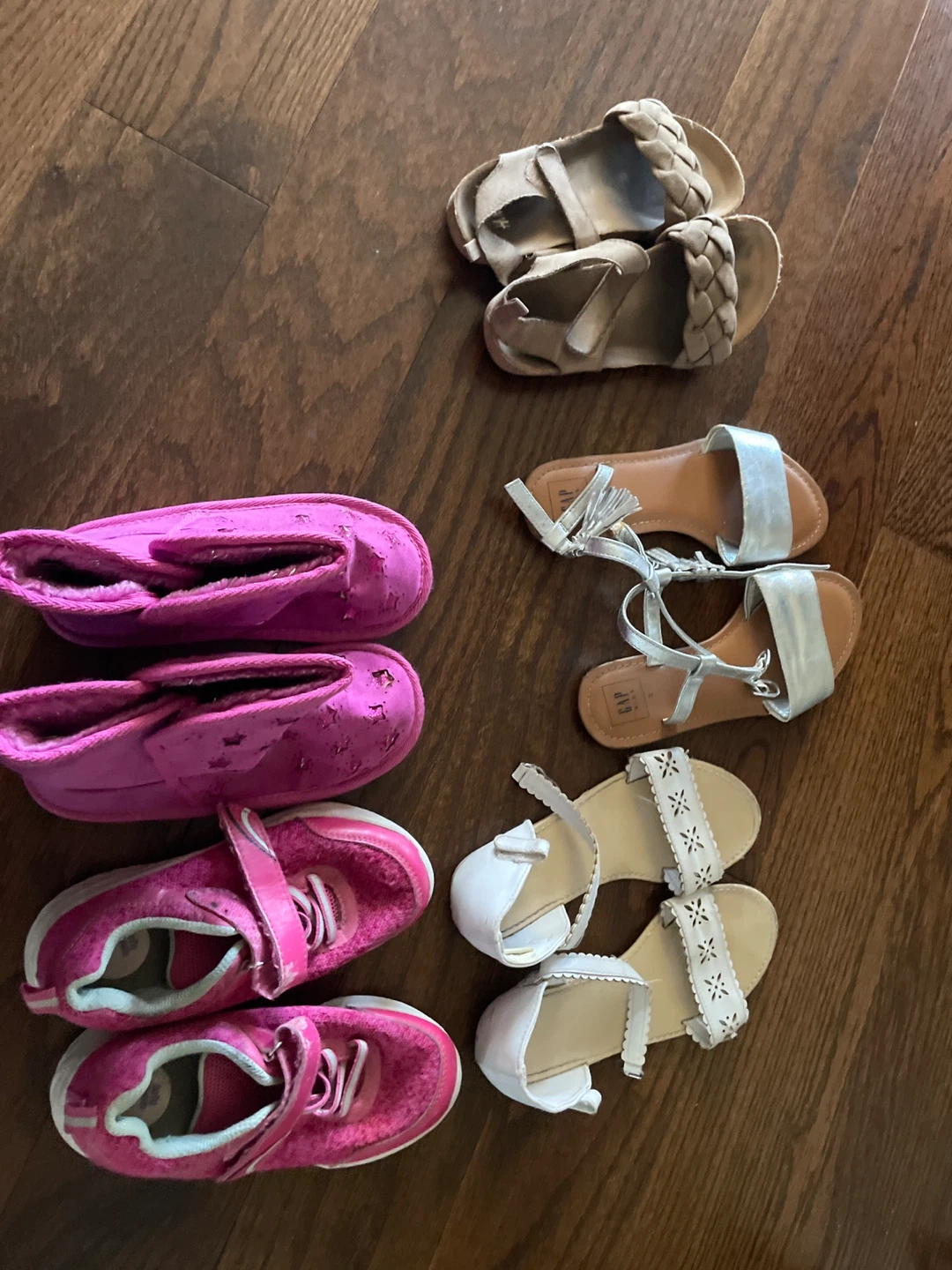 A collection of girls' shoes in various styles and sizes. Includes sandals, slippers, and sneakers. All shoes show signs of wear, but still have plenty of life left!