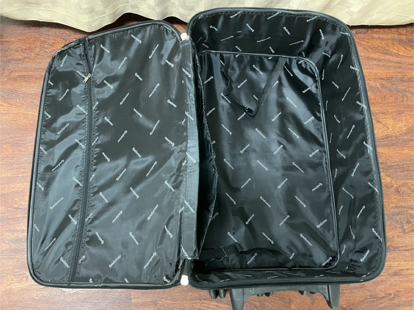 Selling a used black rolling suitcase. It's in good condition and ready for your next trip! It features a retractable handle and smooth-rolling wheels for easy maneuvering. The interior is spacious with multiple compartments to keep your belongings organized