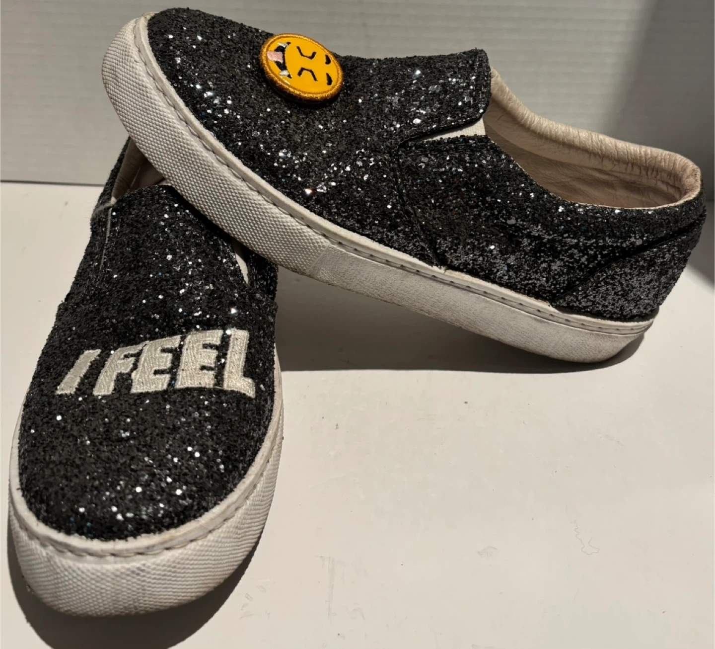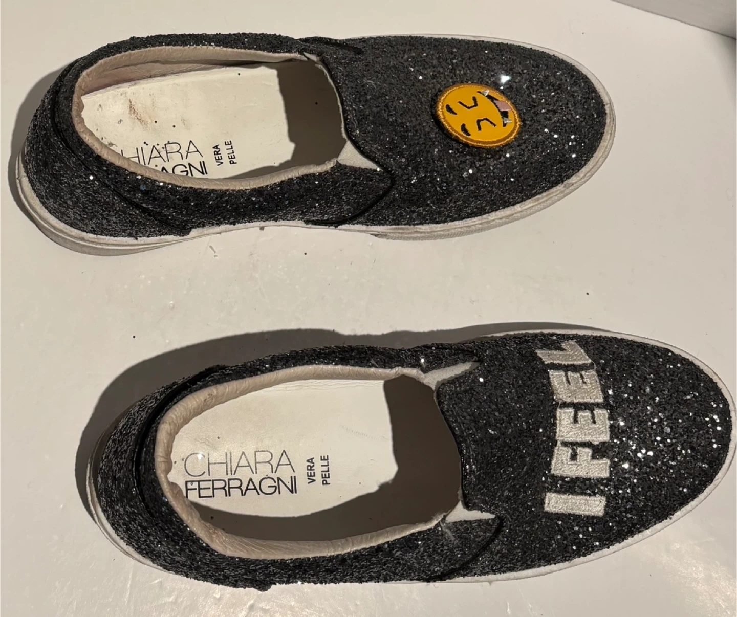 Selling a pair of Chiara Ferragni glittery slip-on sneakers! These are a size 8 and feature a fun "I FEEL" design on one shoe and a cute smiley face patch on the other. They're perfect for adding a bit of sparkle to your everyday look