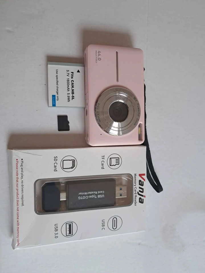 Camera Comes with type c cable (power plug not included). Also come with a usb 3.0/usb c sd card reader and micro sd reader. Camera has battery and 32gb micros sd card. 44 mega pixel camera. Camera screen has like dots shown in pictures. On darker colours hard to notice it's there. Sample photos shown in ad from actual camera