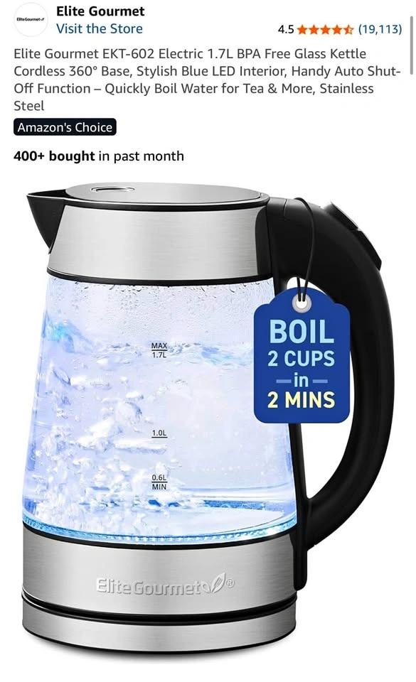 New in box Elite Platinum cordless electric kettle. Enjoy your tea quickly and easily! Just pour water in the 1.7 liter tank and press the button!