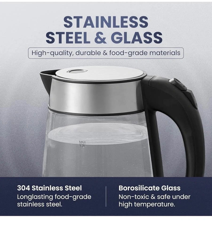 Sturdy and stylish stainless steel kettle with a blue LED illuminated interior. Large pouring spout features a mesh filter for spill-proof pours. Auto shut-off function.