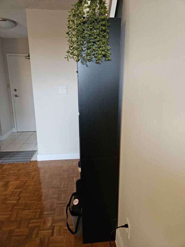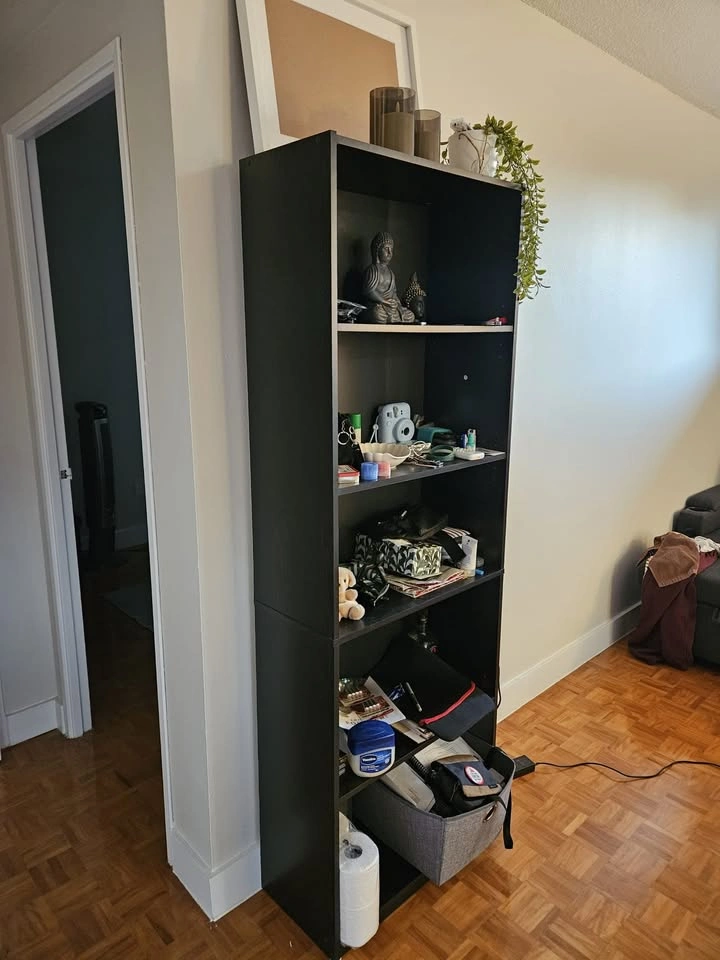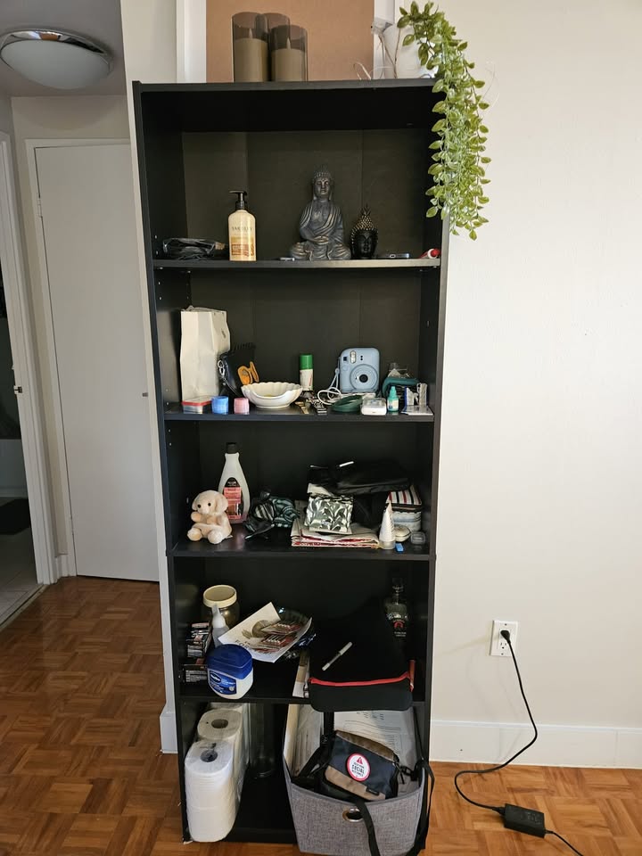 Modern black bookshelf purchased just five months ago from Walmart. It's in fantastic condition and ready to organize your home. Its sleek design and five spacious compartments make it not just useful, but a beautiful addition to any room.