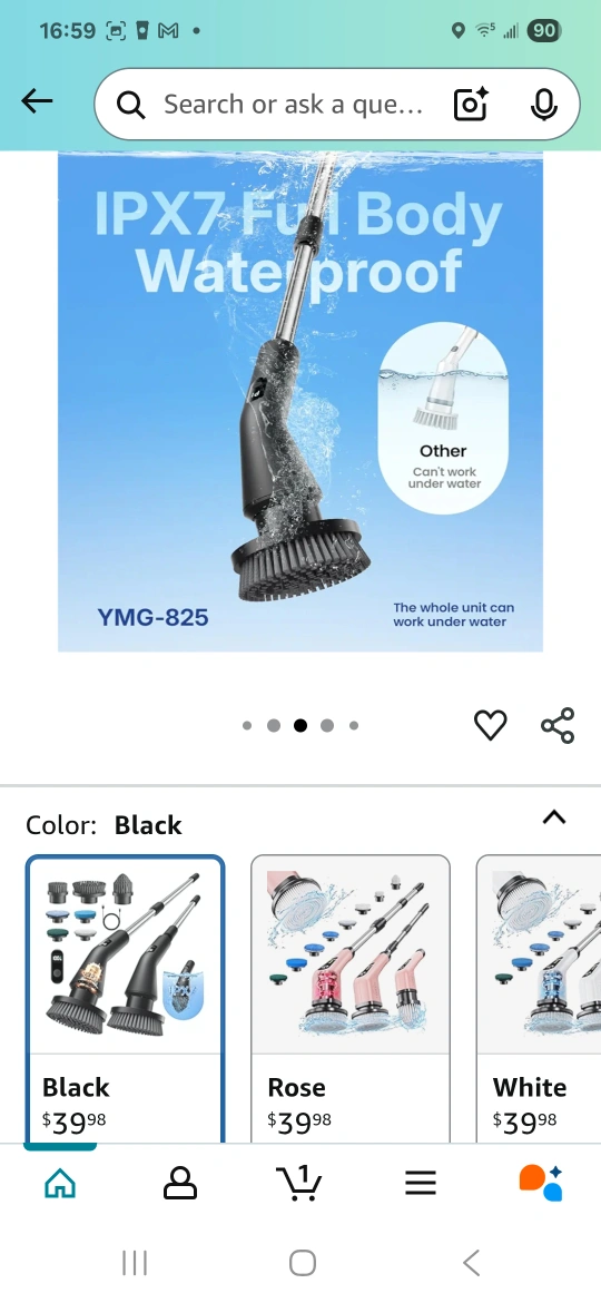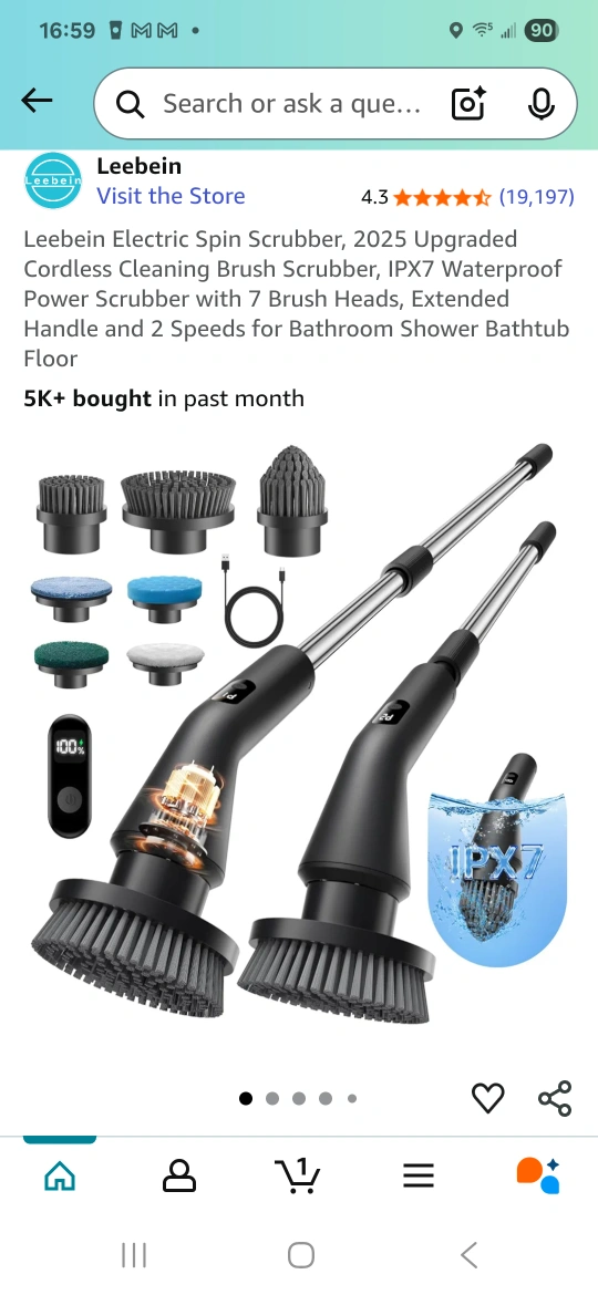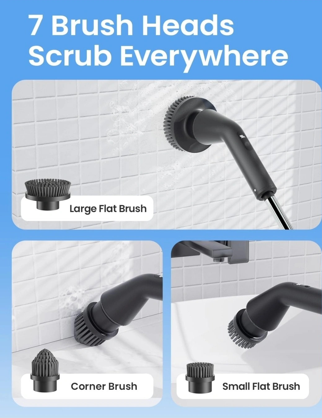 It comes with 7 brush heads to scrub everywhere, including a large flat brush, corner brush, small flat brush, cloth brush, sponge brush, faux fur brush, and scouring pad brush. The scrubber also has a battery and speed display.