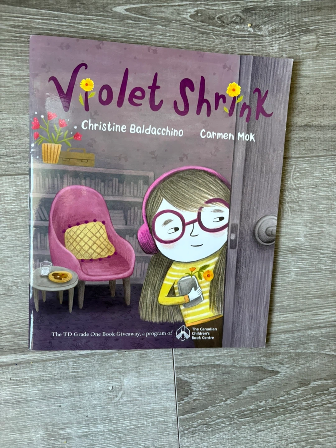 Selling the book 'Violet Shrink' by Christine Baldacchino and Carmen Mok.