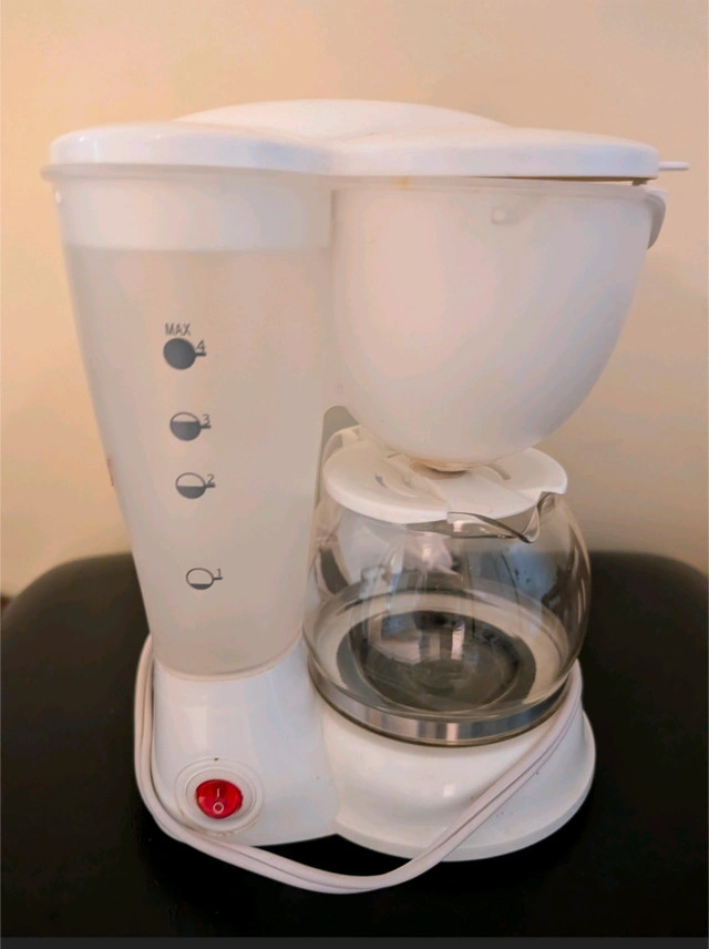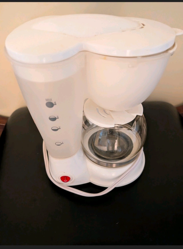 Selling a white coffee maker. It's in good condition and ready to brew your favourite coffee. It has a glass carafe and a water level indicator on the side. Perfect for a small kitchen or office. Let me know if you're interested!