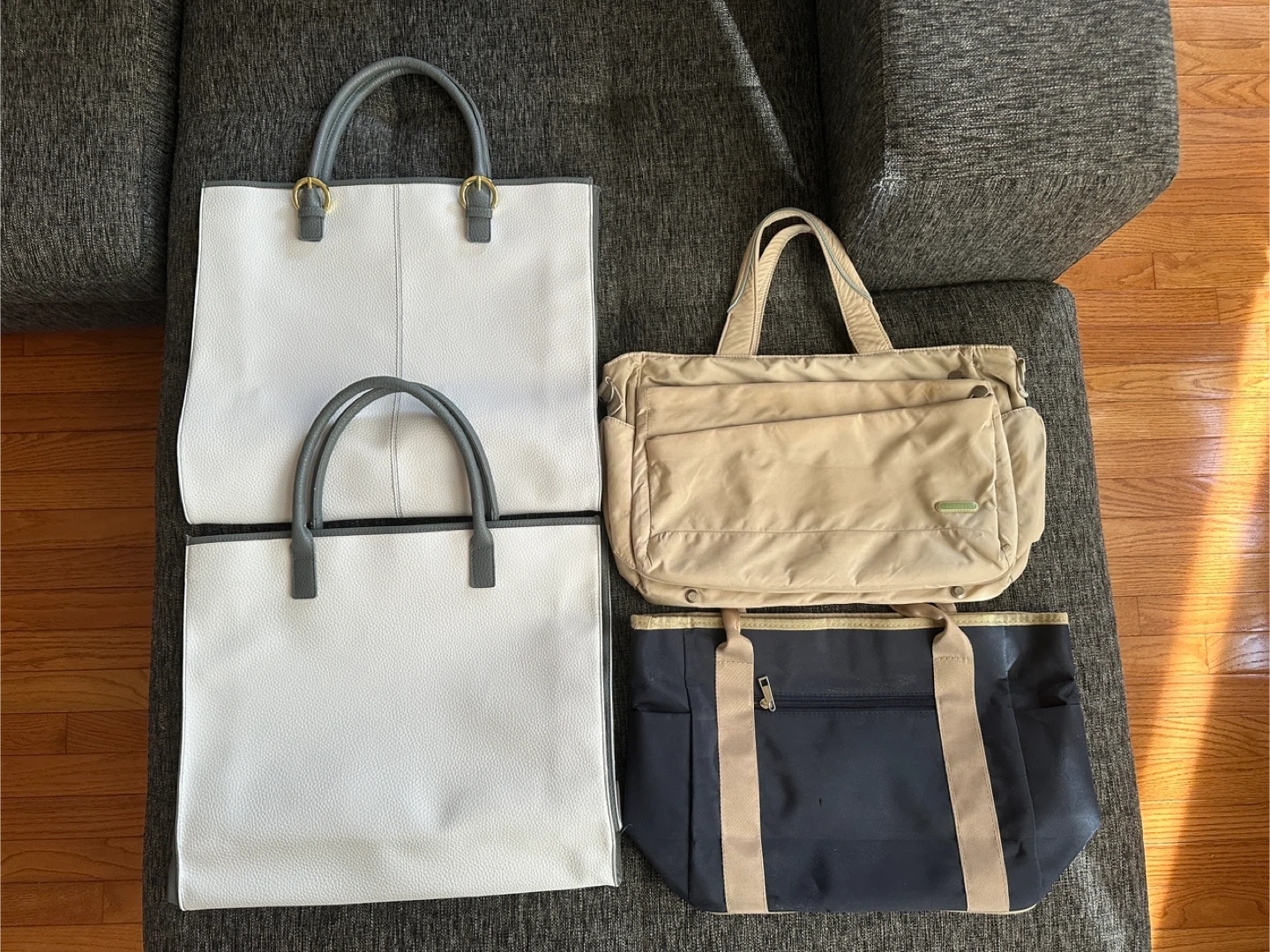 I am selling a lot of four assorted tote bags, perfect for shopping, work, or everyday use. These bags are in great condition, 2 white bags are new.