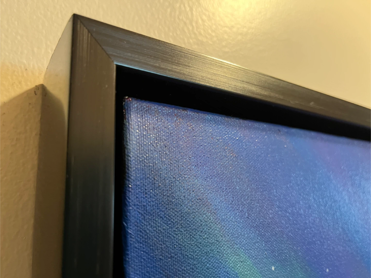 “Lakeside Luminescence”, oil on canvas, 24x30, by local artist (seller). Framed in a black 26x32 floater frame.