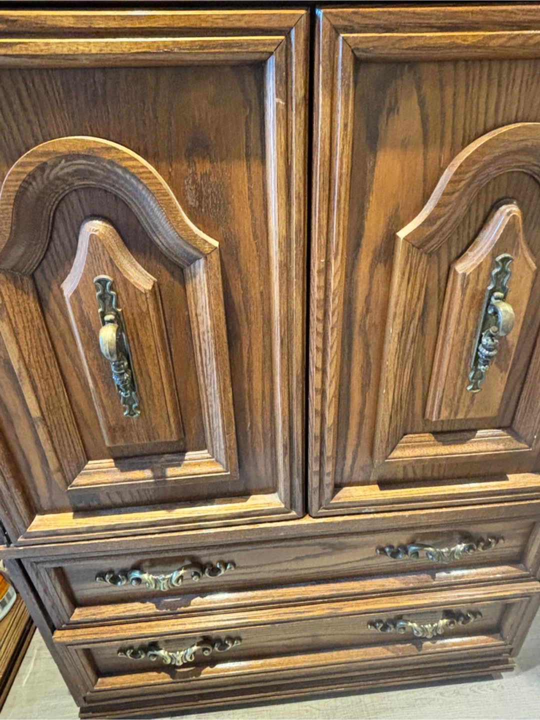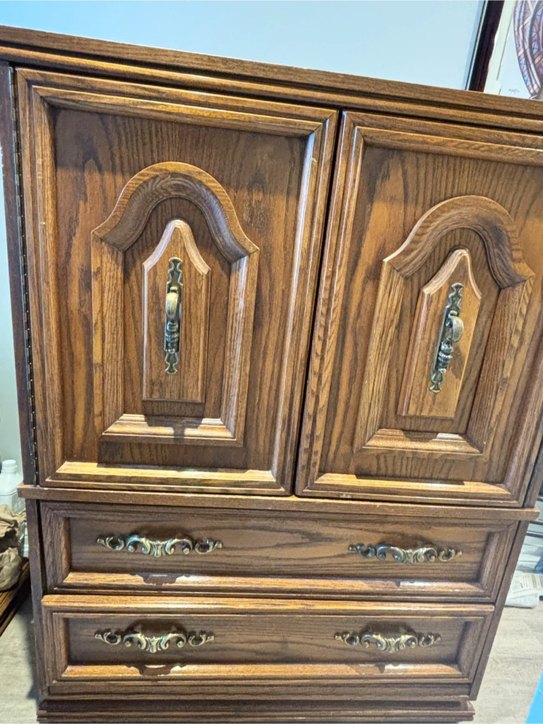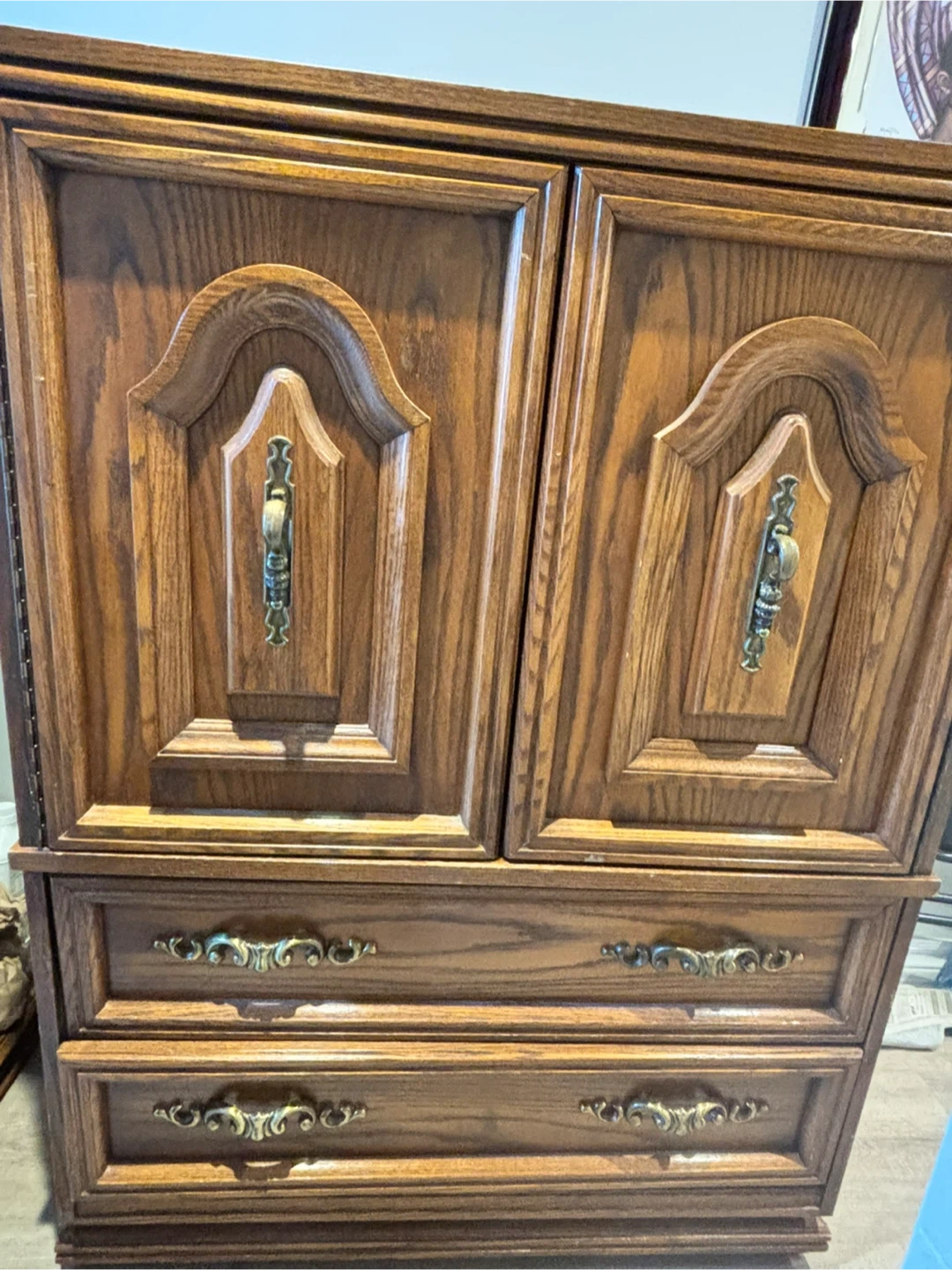 Selling a vintage wooden armoire/cabinet. It features two doors up top and three drawers below. It's a solid piece of furniture with a classic design. It would be a great addition to any home!