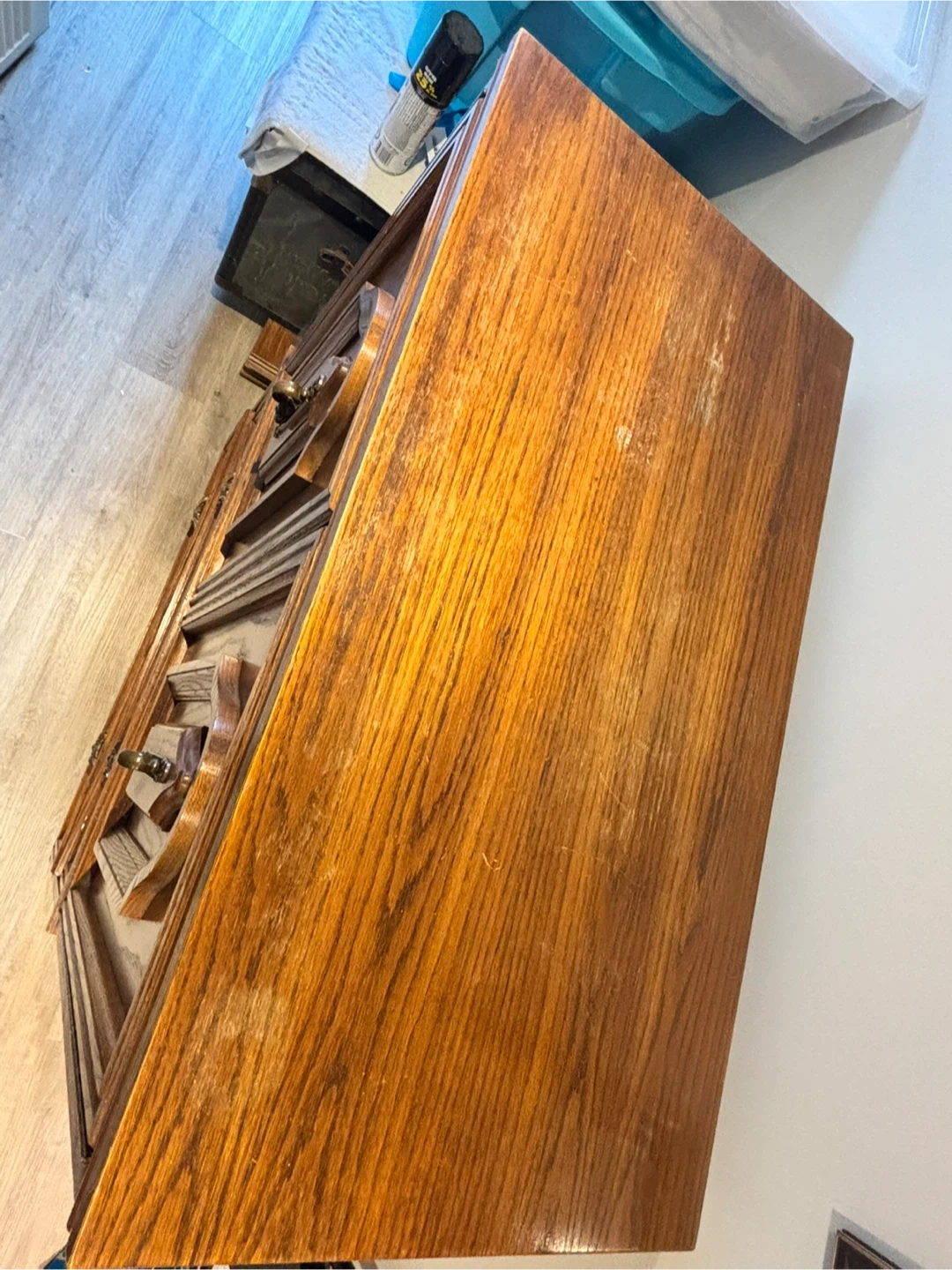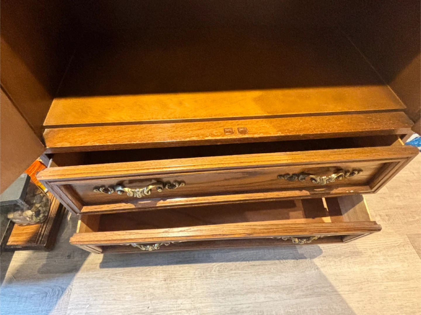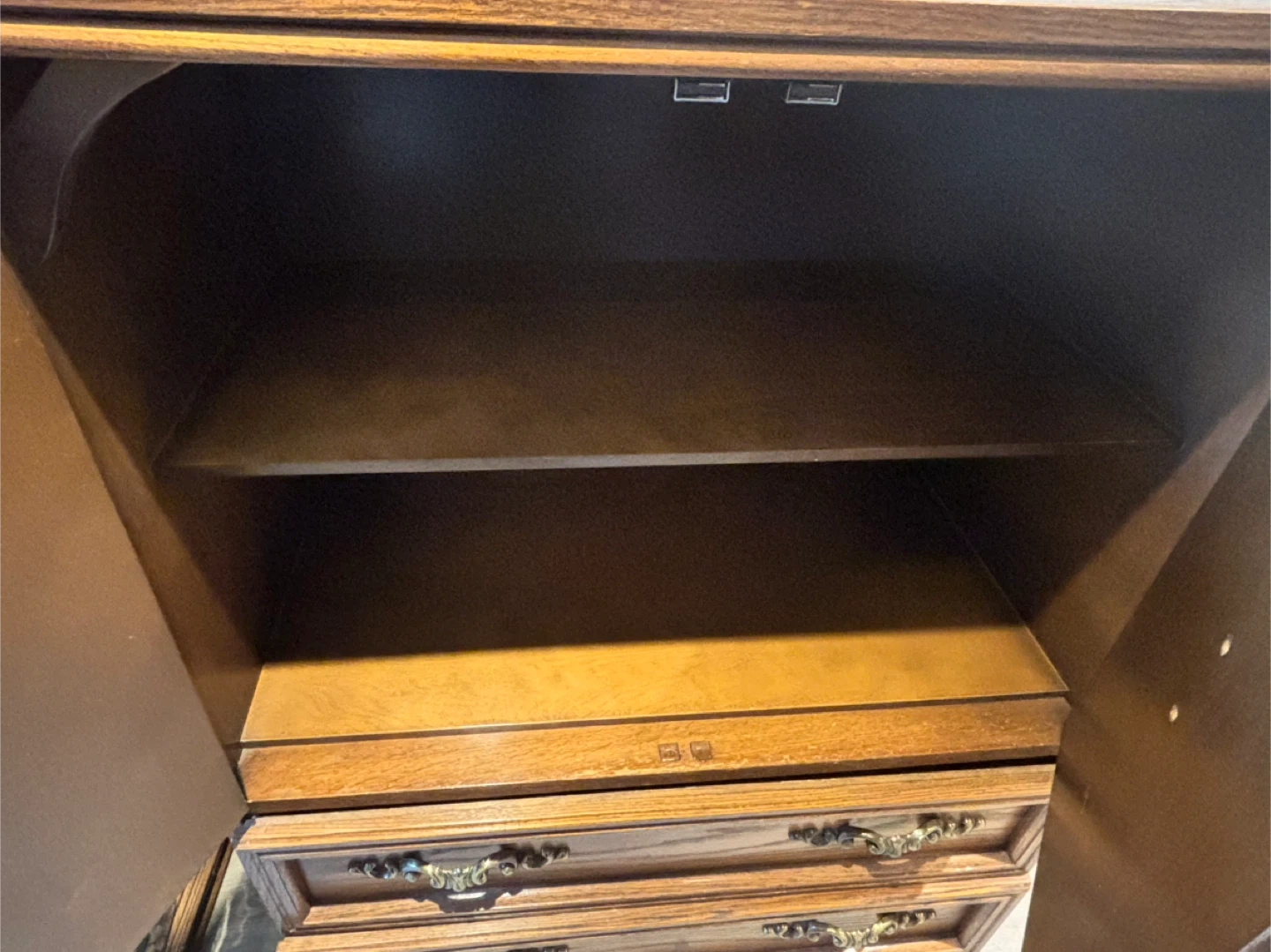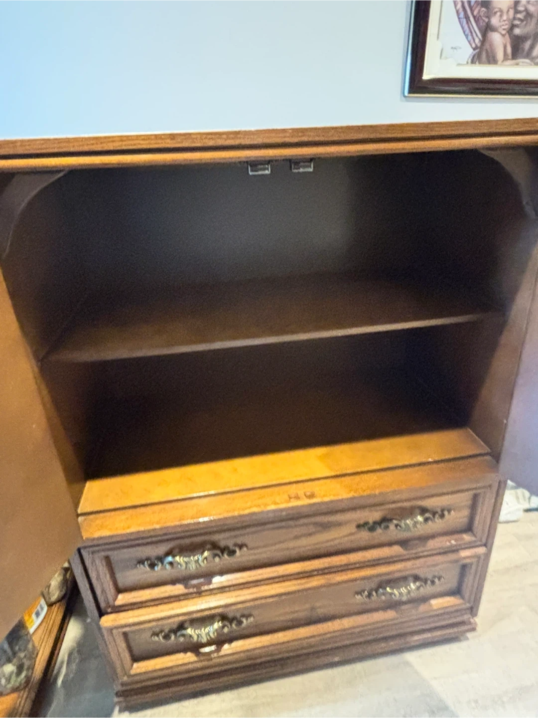 Selling a vintage wooden armoire/cabinet. It features two doors up top and three drawers below. It's a solid piece of furniture with a classic design. It would be a great addition to any home!