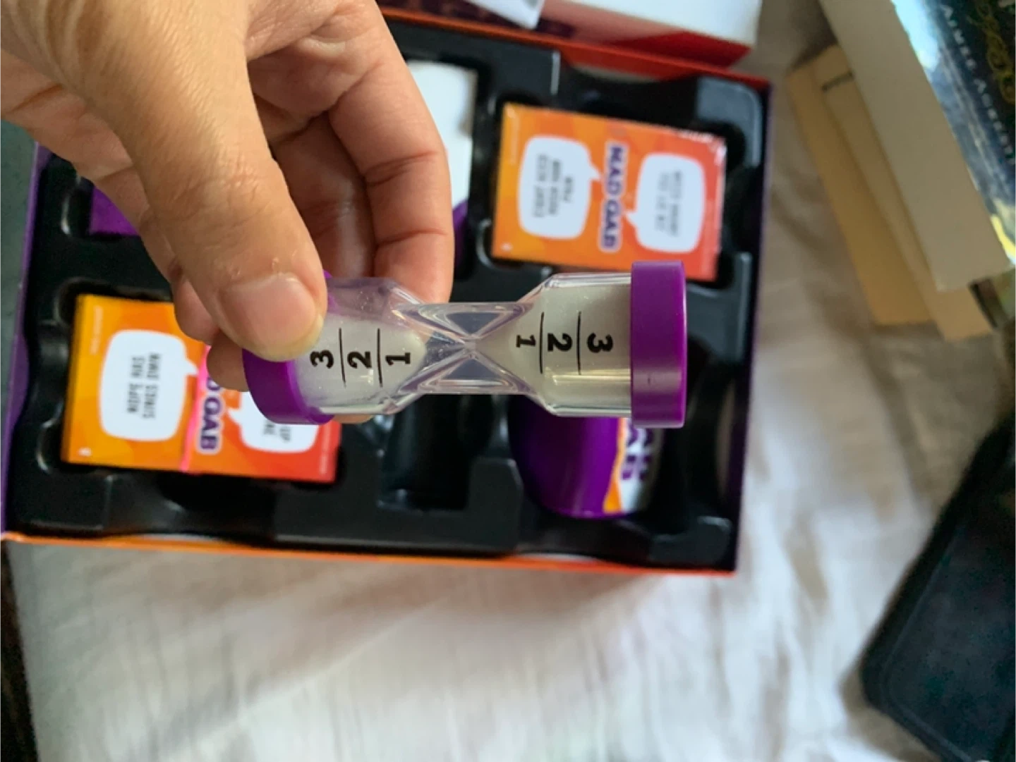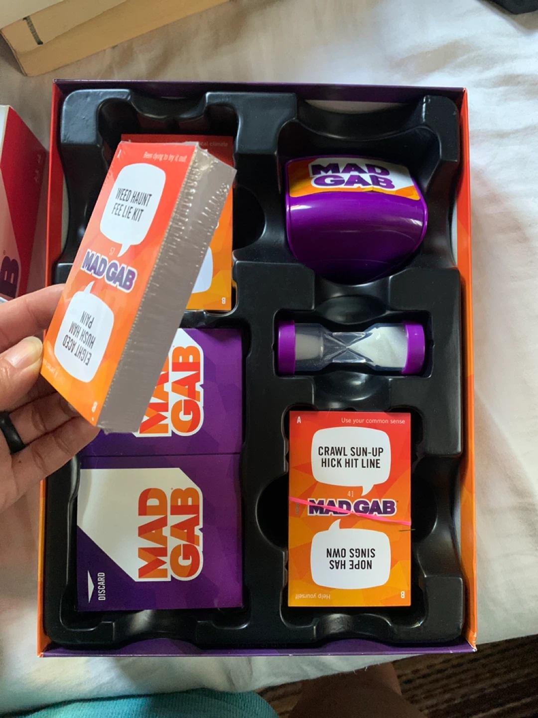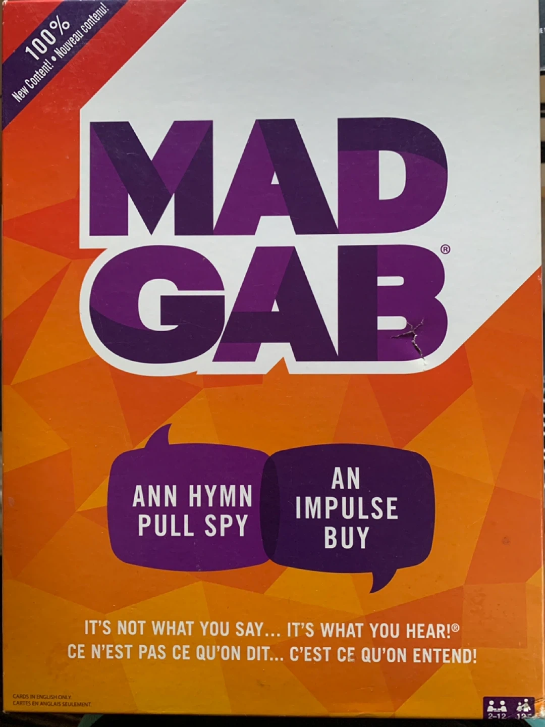 Mad Gab game for some family fun! It's a game where you read groups of words aloud, and quickly try to figure out what they sound like when said naturally. Includes all the cards and the timer too!