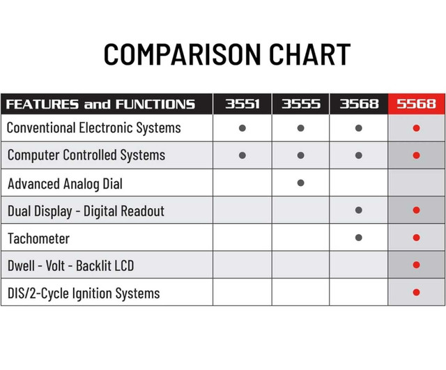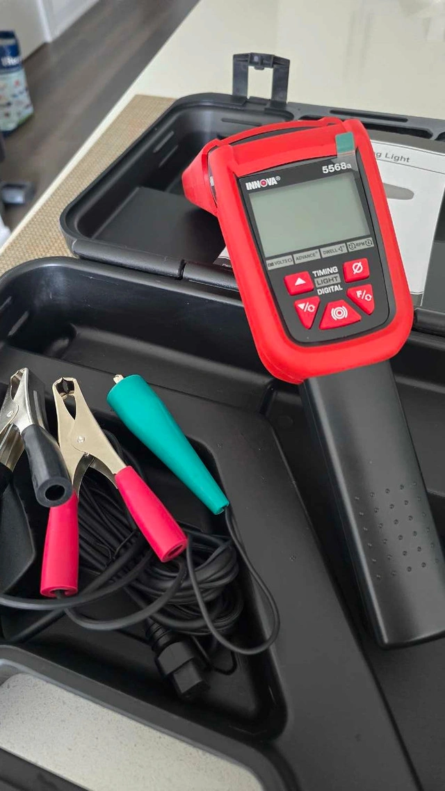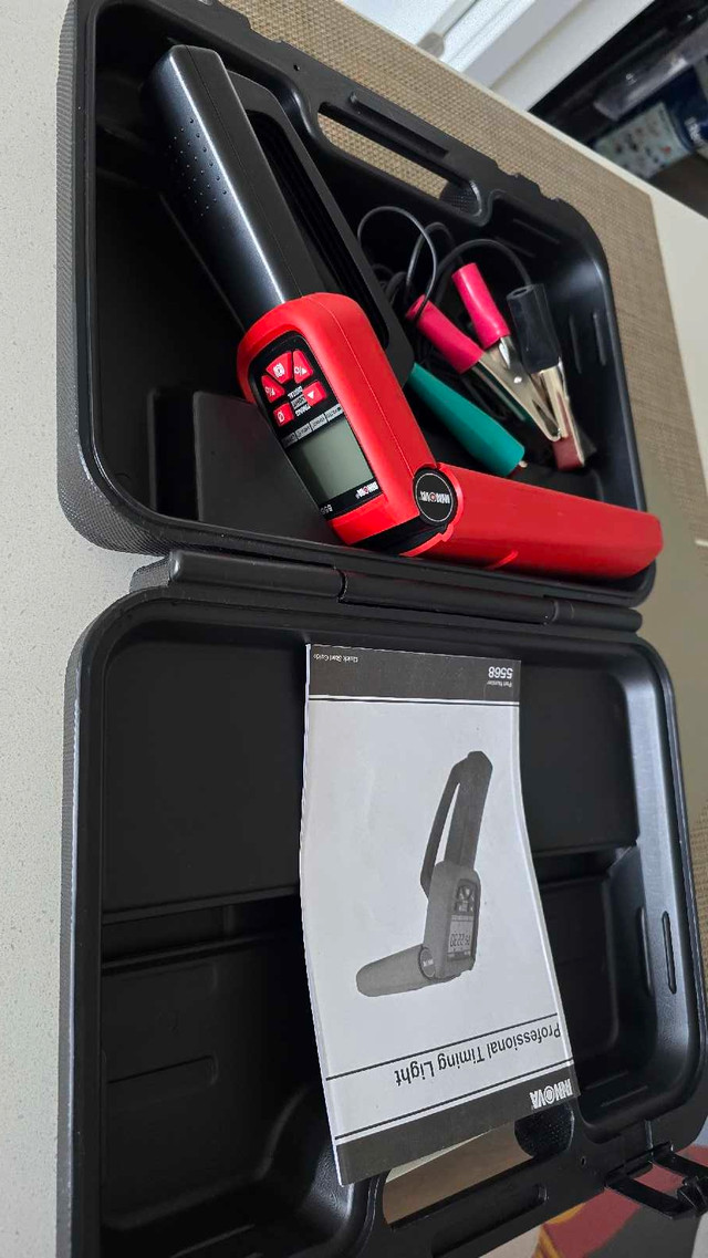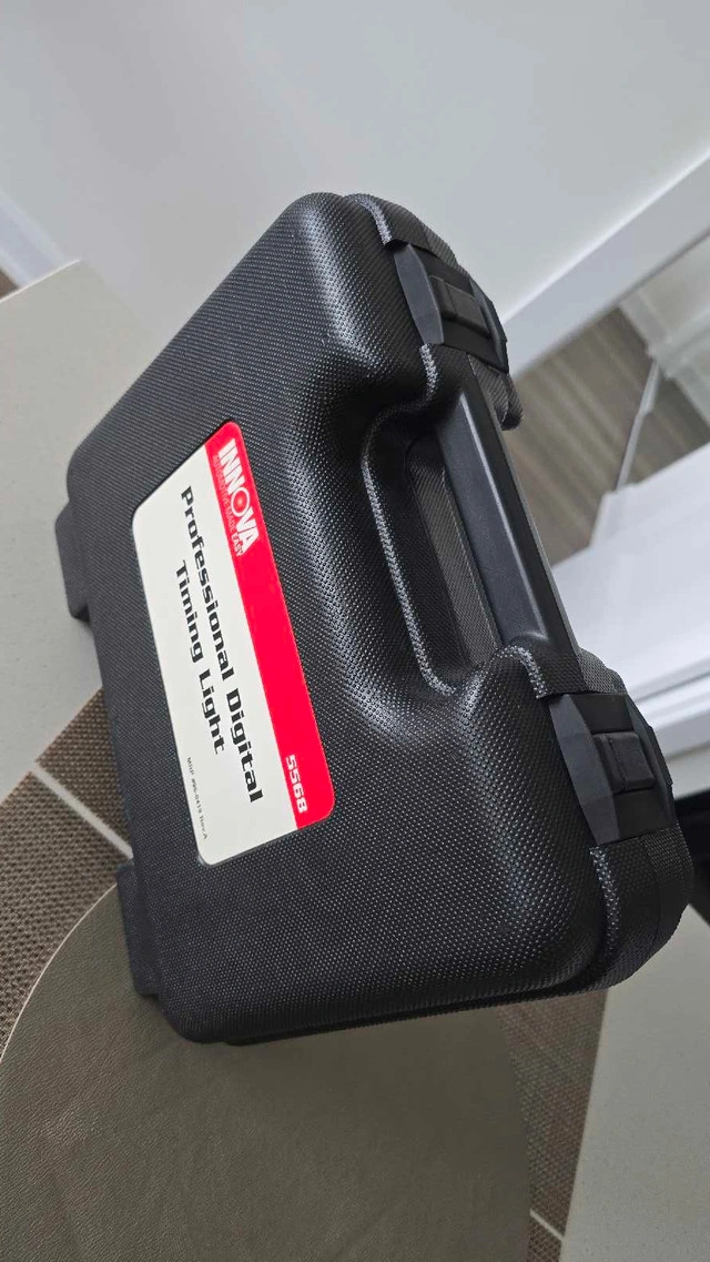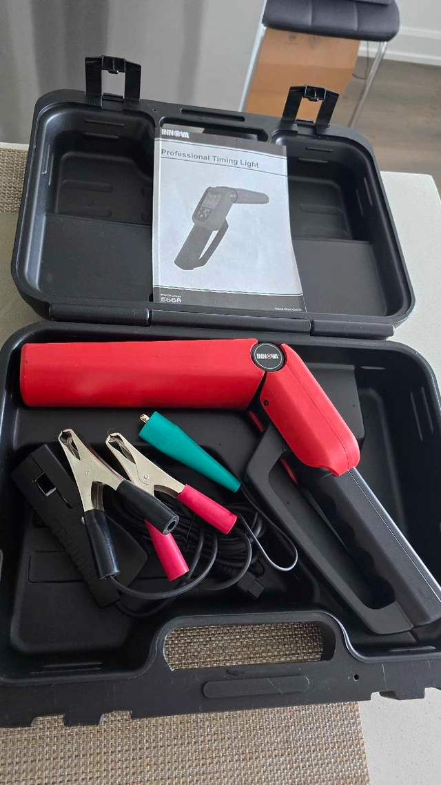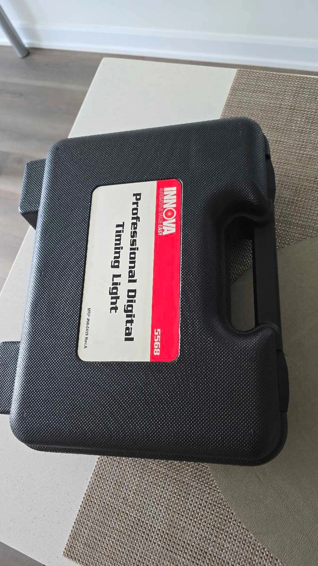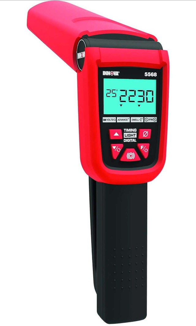 INNOVA 5568 Pro-Timing Light with Tool Case. The INNOVA 5568 Pro Digital Timing Light is built with a heavy-duty ABS shockproof housing and protected by a molded boot, providing extra safety against accidental drops and engine fan blade contact. Its bright backlit display ensures clear visibility even in low-light areas. This advanced timing light features a four-function digital readout, including: Tachometer: 249–9,990 RPM Advance Degrees (2- & 4-cycle): 0–90° Dwell (2–12 cylinders): 0–180° Voltage: 10–16V DC Durable, accurate, and easy to read—perfect for professional and DIY engine work.