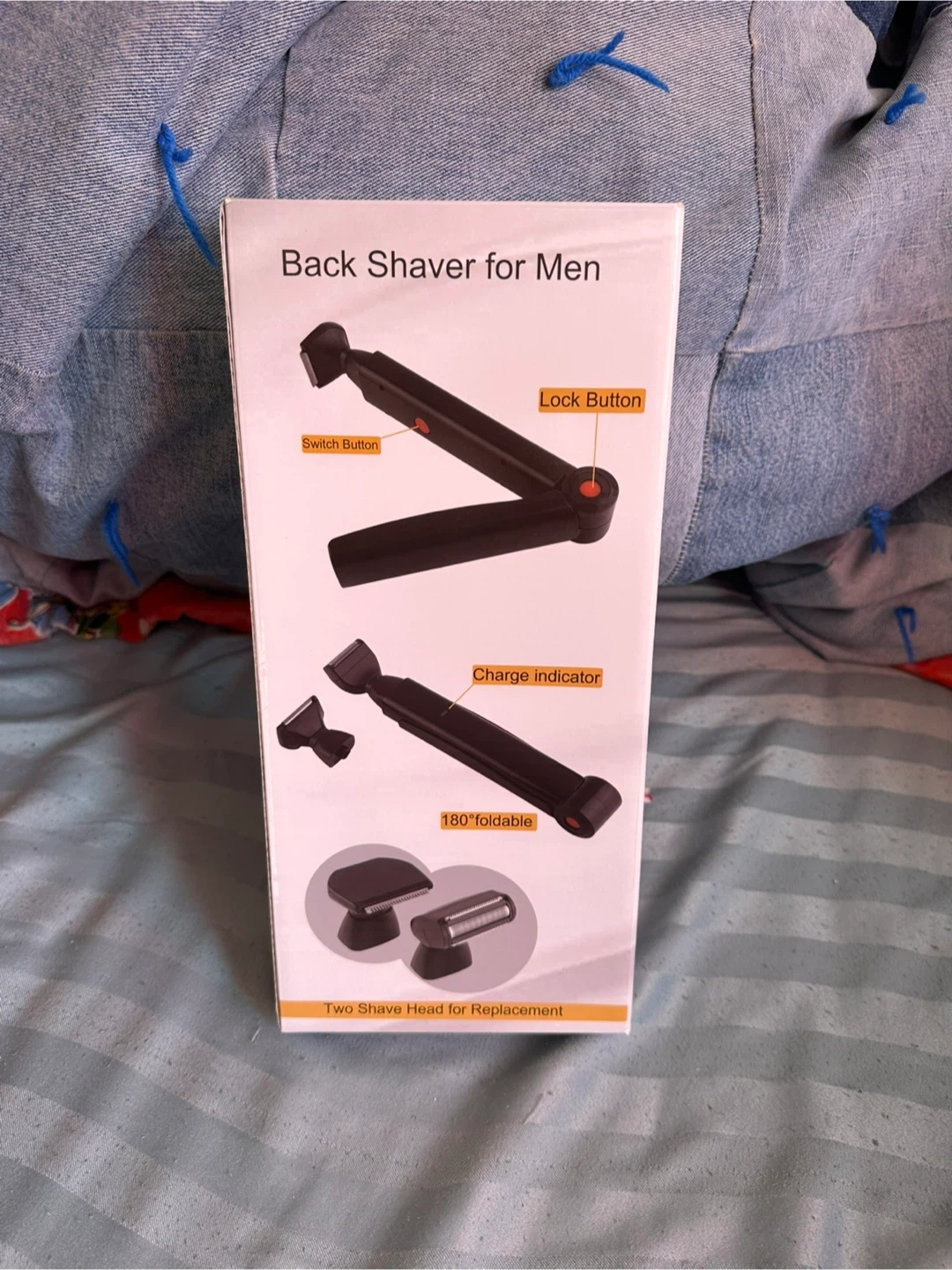 Selling a back shaver for men! It features a lock button, switch button, and a charge indicator. It's also 180° foldable and comes with two shave head replacements