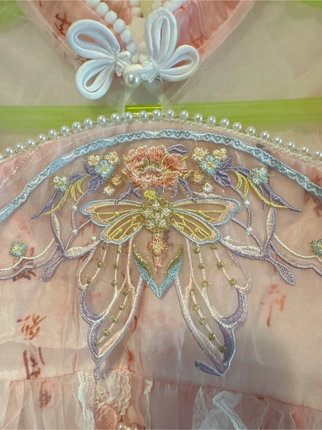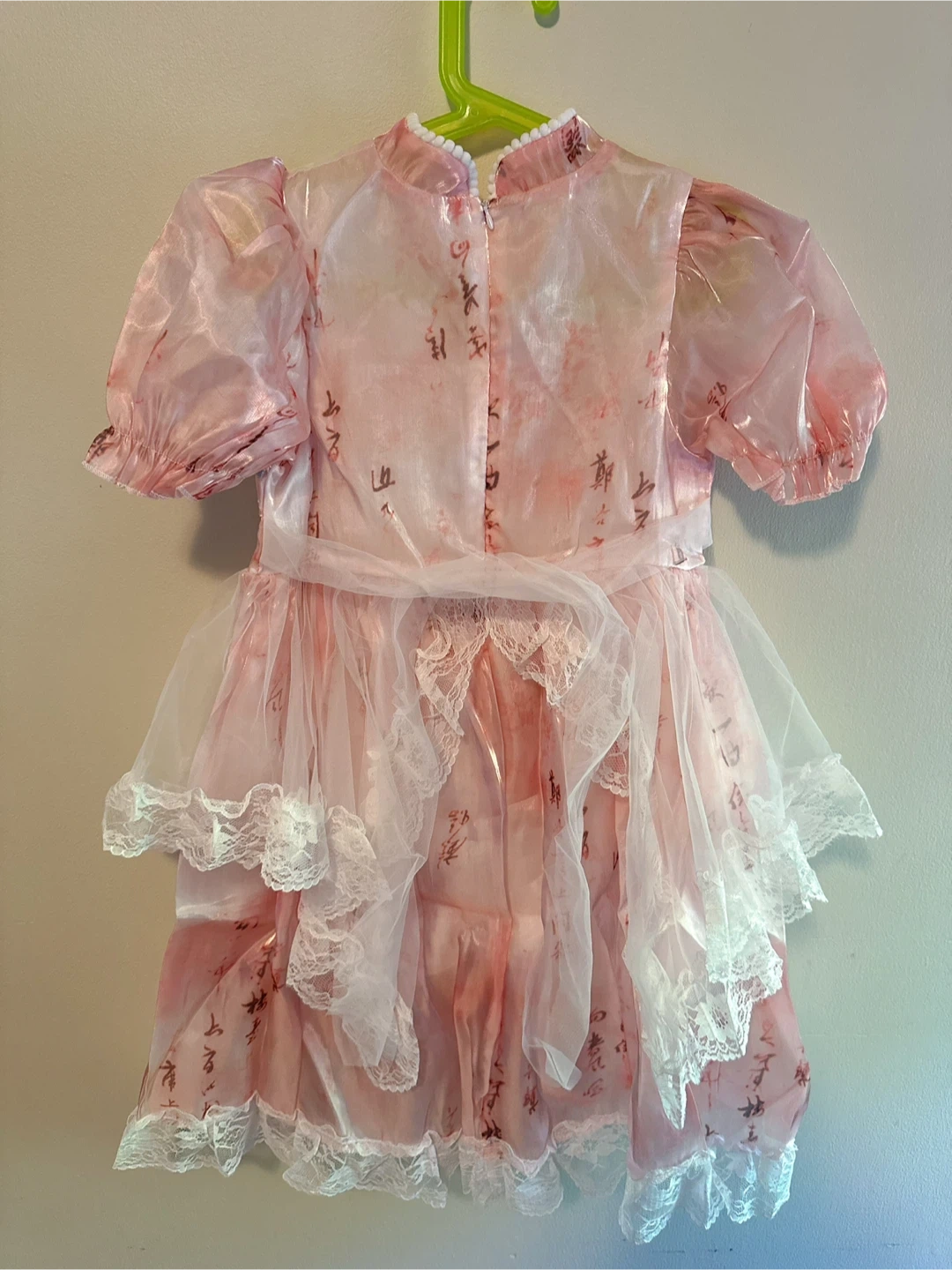 A beautiful pink dress featuring delicate floral embroidery! It's a unique piece that would be perfect for a special occasion or just to add a touch of elegance to your wardrobe. The dress has a lovely flowing design with lace detailing. 100% cotton inner layer.