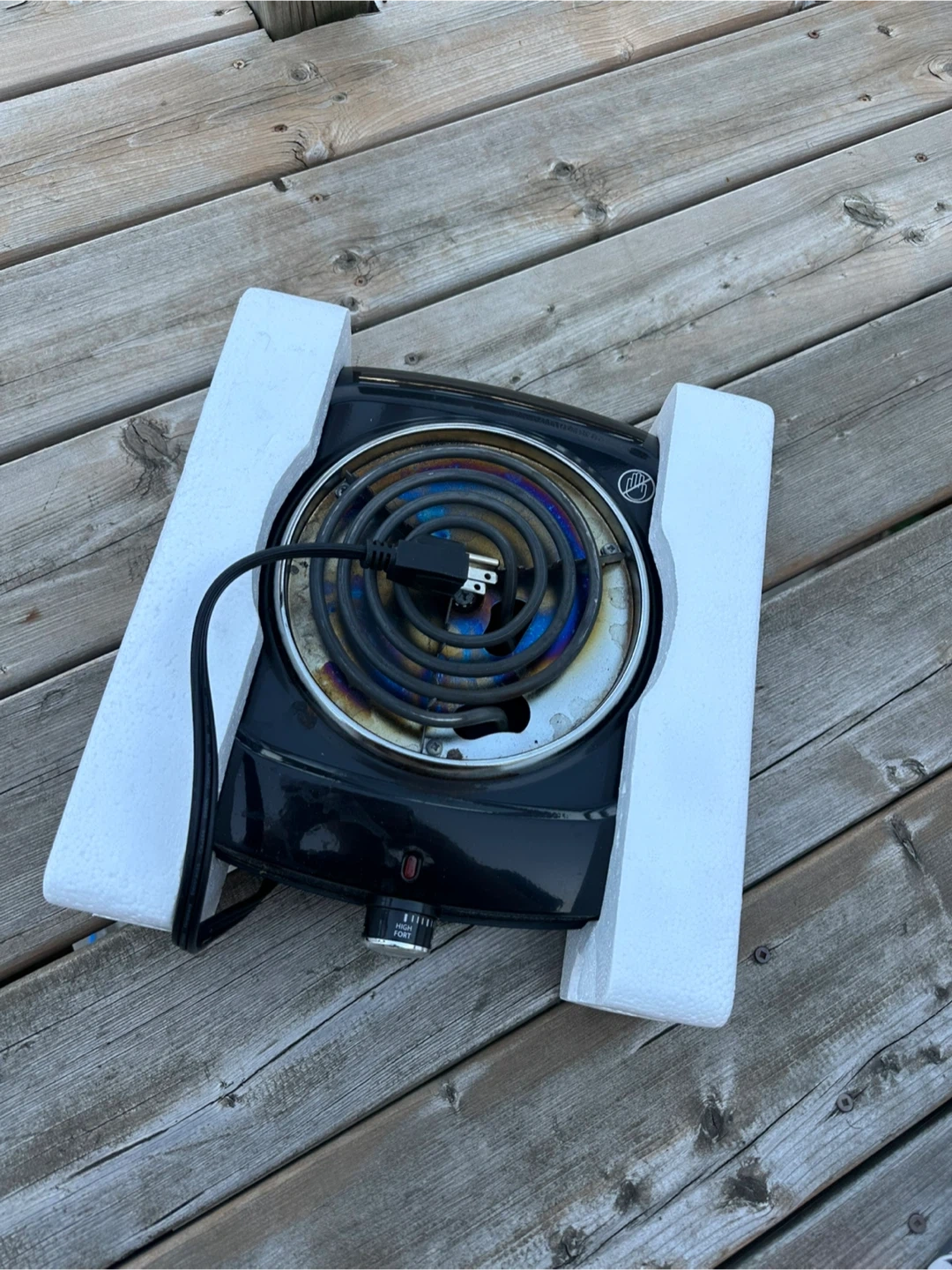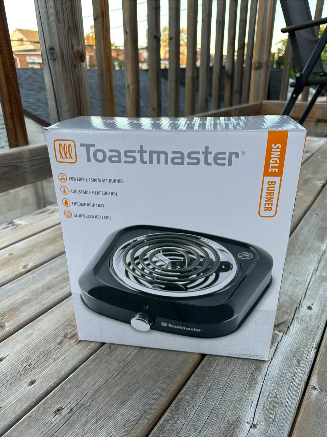 Selling a Toastmaster single burner. It's a powerful 1500 watt burner with adjustable heat control and a chrome drip tray. The coil is reinforced for durability. It comes with the original box!