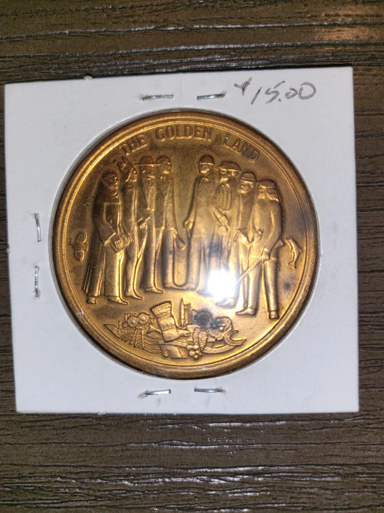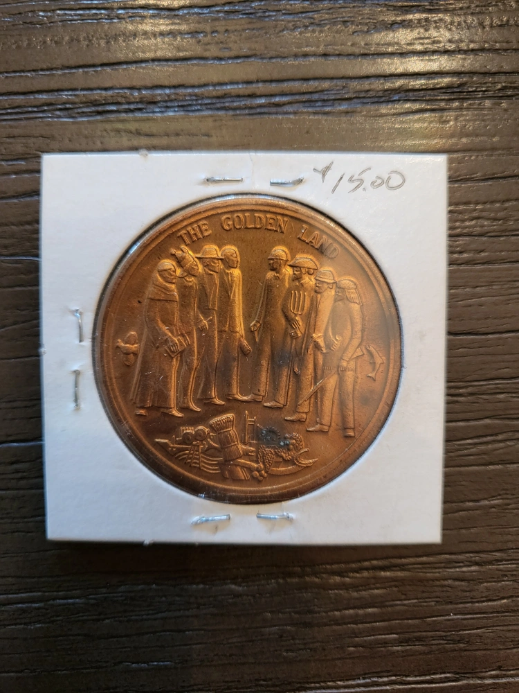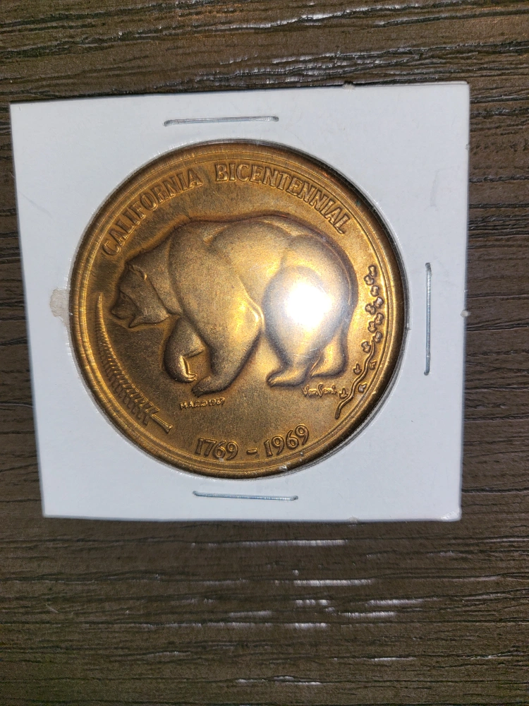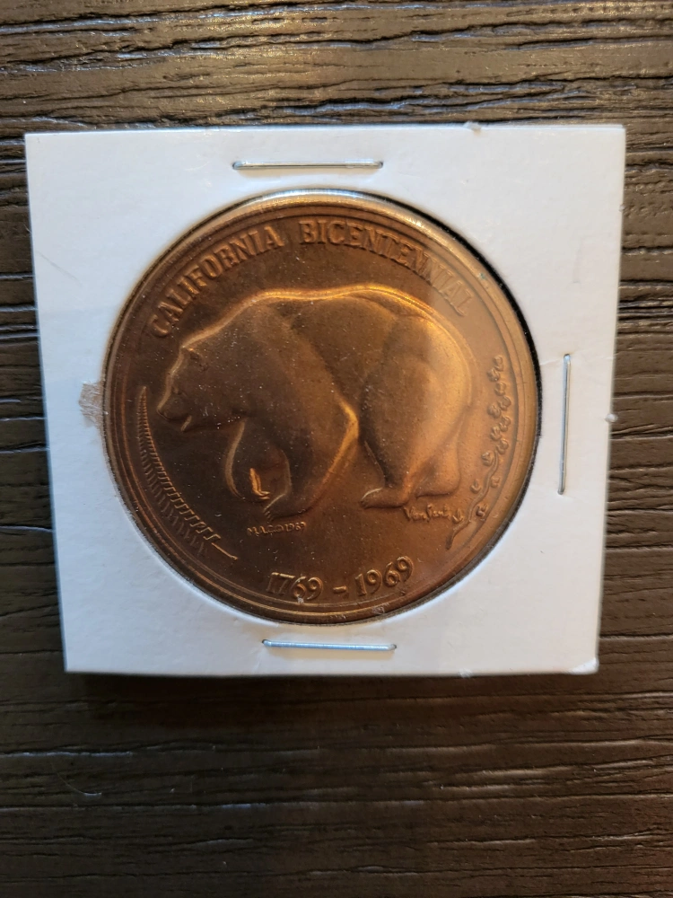 Selling a California Bicentennial token. It commemorates the years 1769-1969. Features a bear on one side and a group of people on the other. This is copper and approx 1.5 inches in diameter.