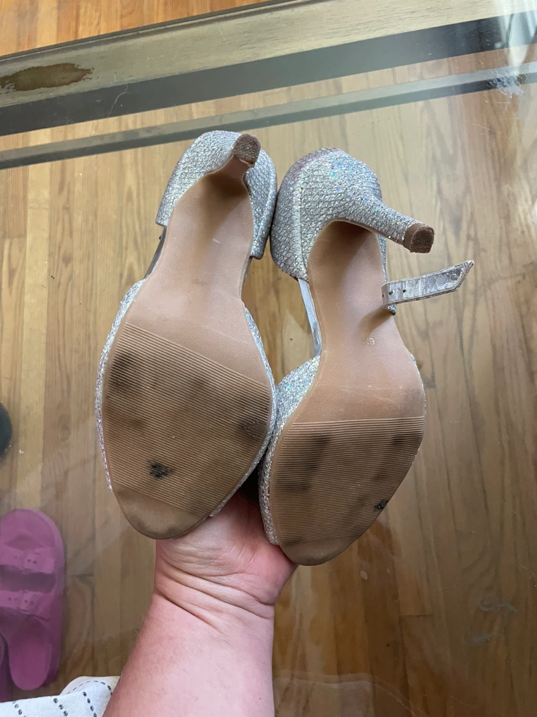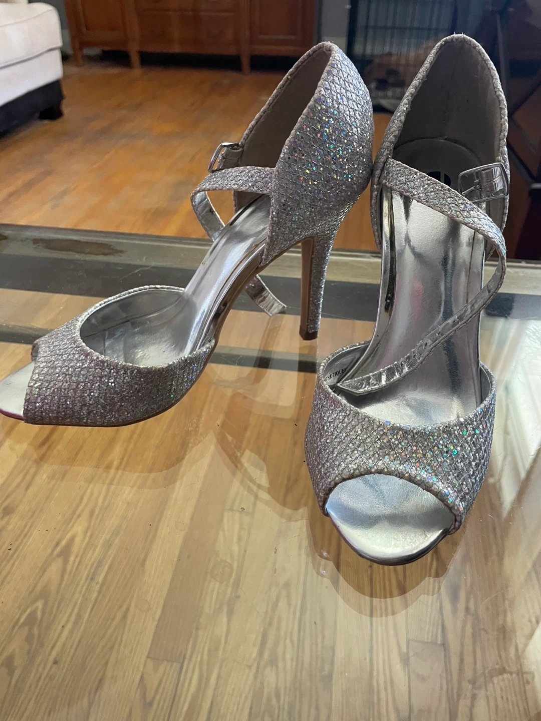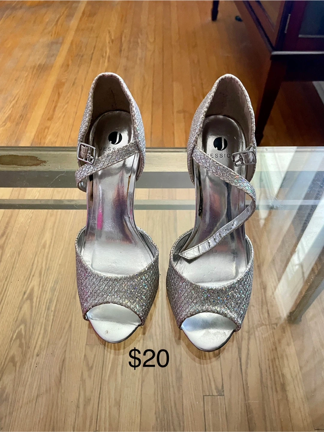 Selling a pair of Jessica Simpson heels in size 6.5. These heels are silver and feature a sparkly, glittery design. They show some signs of wear on the soles, but are still in good condition for a night out or a special occasion!