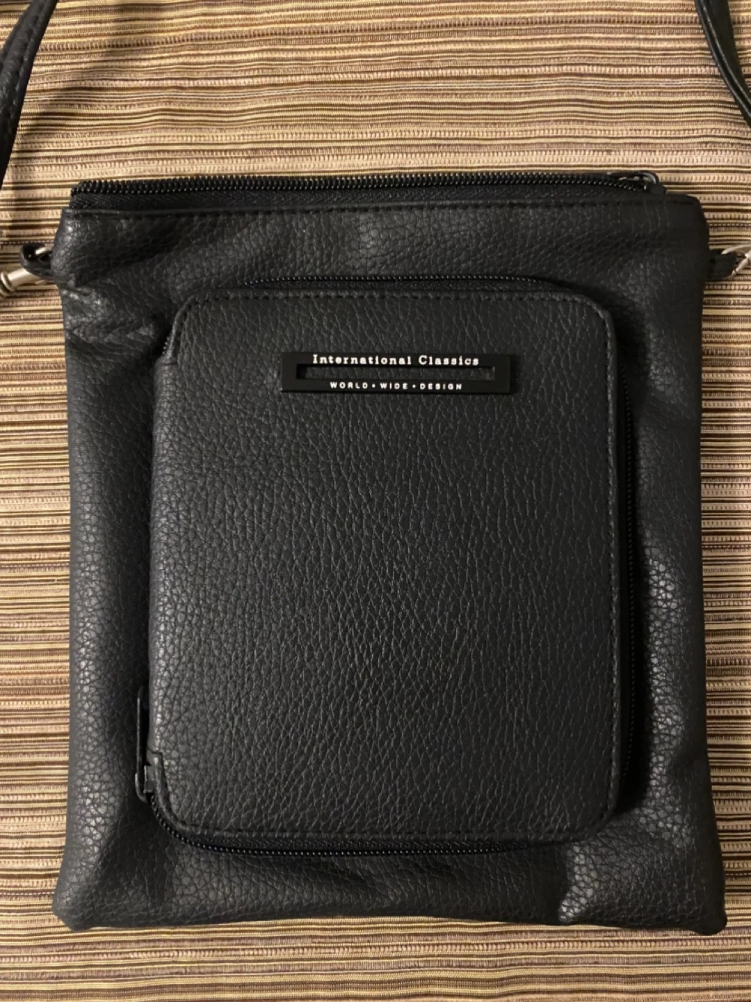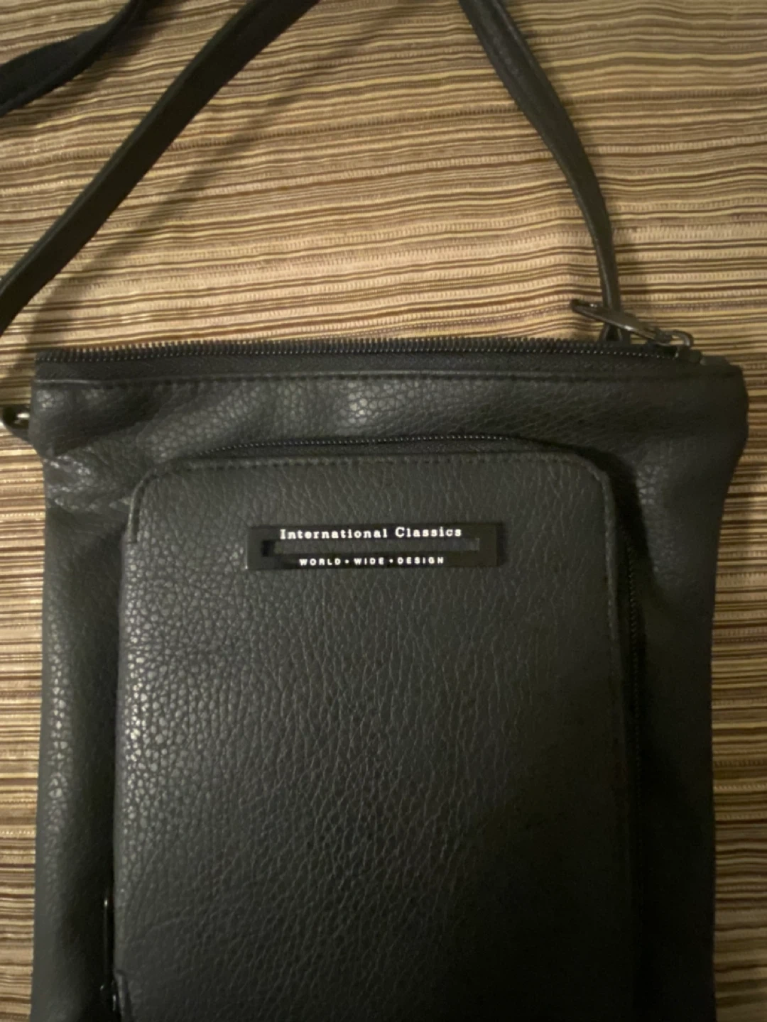 Here's a stylish black crossbody bag from International Classics! It has a convenient front zippered pocket with a compartment organizer that holds bills, coins, ID, passports and cards! Slim design measuring 7..5” x 8.5”