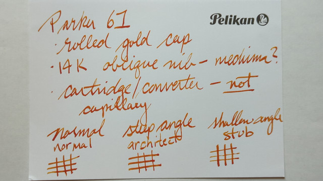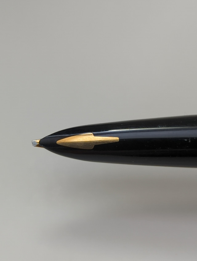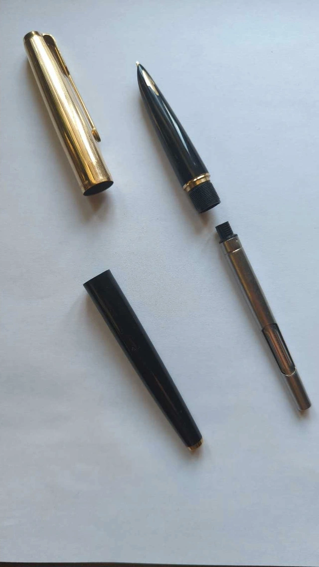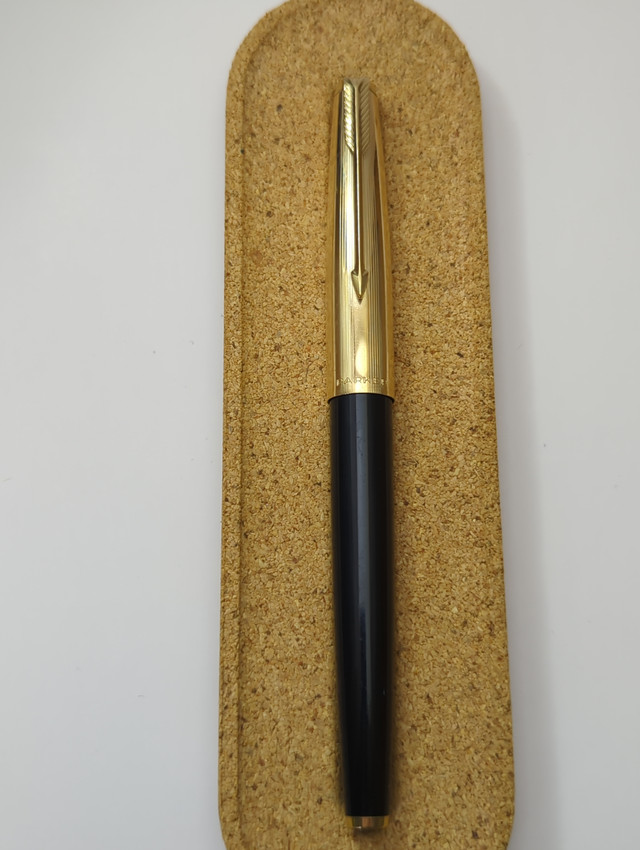 Vintage Parker 61 fountain pen with a black body and gold cap. It has an inlaid arrow on the section, dual jewels, and a 14k oblique medium nib with some nice line variation. It uses standard Parker cartridges and comes with a squeeze converter. Pick up only. I can meet at Spadina, Bathurst, or Dupont stations (or somewhere nearby them). I ignore lowball offers. If the post is still up, it's available.