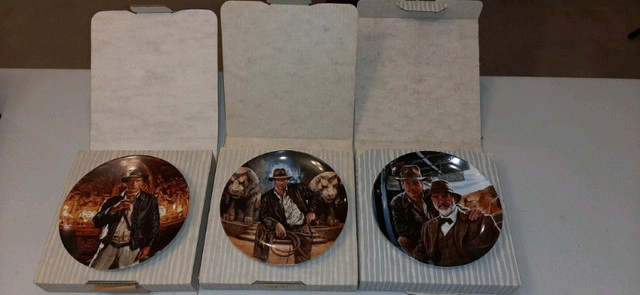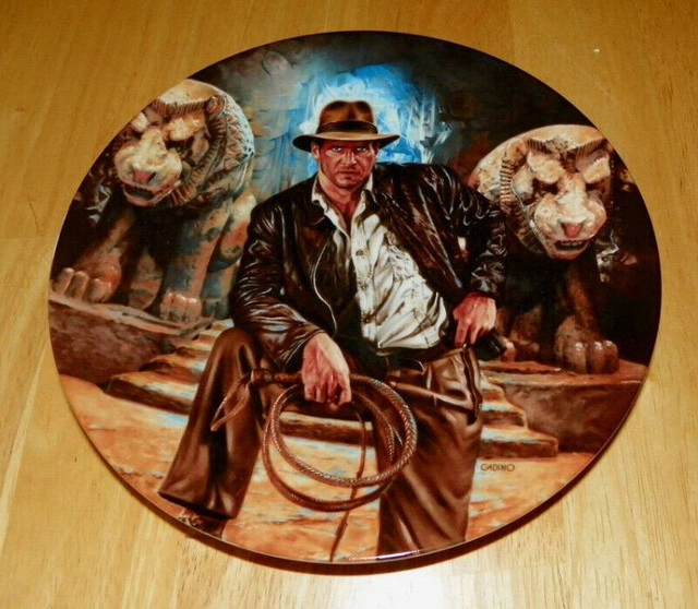 EBAY has these listed and much higher prices. Here's your chance to get these items that have been retired and no longer sold. Prefer to sell for total. INDIANA JONES MINT IN BOX, COA Numbered with certificate of authenticity. The premier plate which was a first issue in the adventures of Indiana Jones and the Last Crusade. This artwork was created by Victor Gadino. All of the original paperwork is still in the box and in perfect condition. The back of the plate bears the Seal of the Indiana Jones logo. This comes with the collector's assurance that the traditional century old steps of the plate being individually shaped, dried, fired, glazed, glost-fired, and given decoration, has not been altered. Included is the original pamphlet, entailing the plate's information. THIS ITEM IS FROM A SMOKE FREE HOME 3 Plates - Indiana Jones, Indiana Jones and Dad, Indiana Jones and the Holy Grail More Info: Pop Culture Collectibles