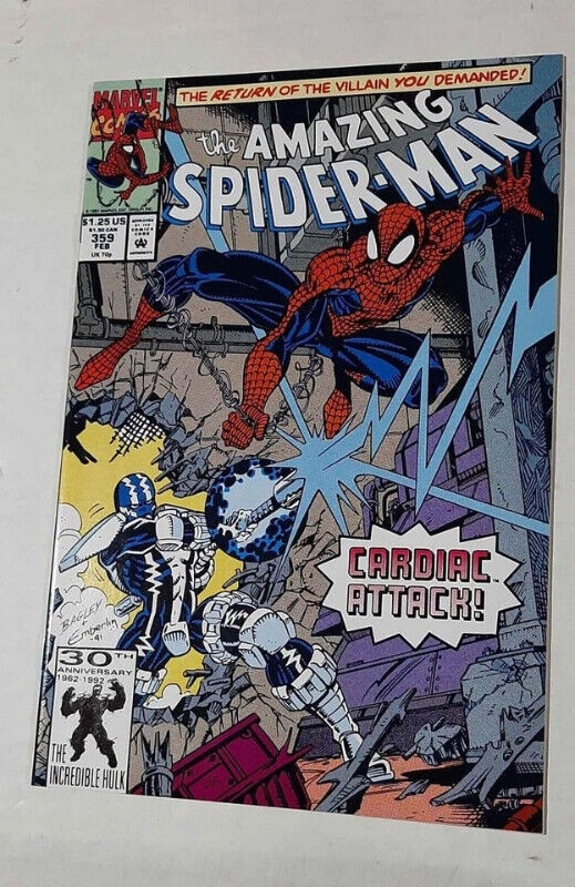 Comic Book - the Amazing Spider-man #359: Toy Death! Part 1 of 2. Script by David Michelinie. Pencils by Chris Marrinan. Inks by Keith Williams. Cover by Mark Bagley and Randy Emberlin. Cardiac is back! And bringing his own brand of justice to the Big Apple! Each day Dr. Elias Wirtham reads the latest corporate exposé in the Daily Bugle...and then goes after that company the following night! But Ben Urich and Peter Parker have caught on to Cardiac's pattern! So the next evening the web-slinger hides away in the manufacturing plant of a corrupt toymaker! Waiting for his very own...Cardiac attack! Cameo appearances by Cletus Kasady, Mary Jane Watson, Flash Thompson, J. Jonah Jameson, and the Black Cat. Condition: Used - Like new. For Sale By: Owner. Curbside pick up available.